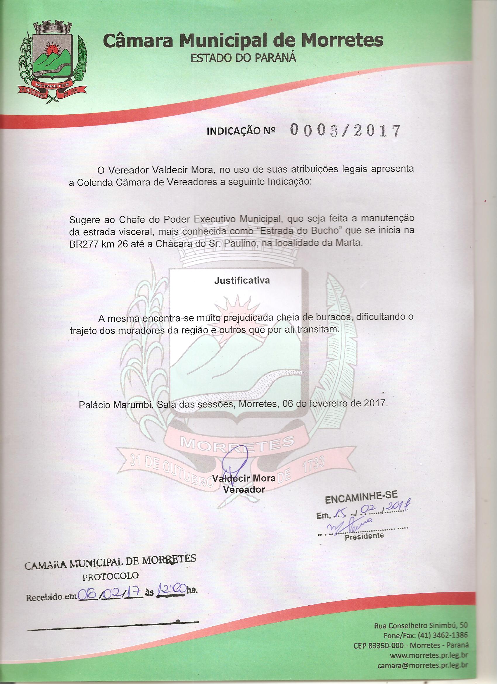 ![]() SUGERE AO CHEFE DO PODER EXECUTIVO MUNICIPAL QUE SEJA FEITA A MANUTENÇÃO DA ESTRADA VISCERAL,MAIS CONHECIDA COMO "ESTRADA DO BUCHO"QUE SE INICIA NA BR 277 KM 26 ATÉ A CHÁCARA DO SR.PAULINO,NA LOCALIDADE DA MARTA .