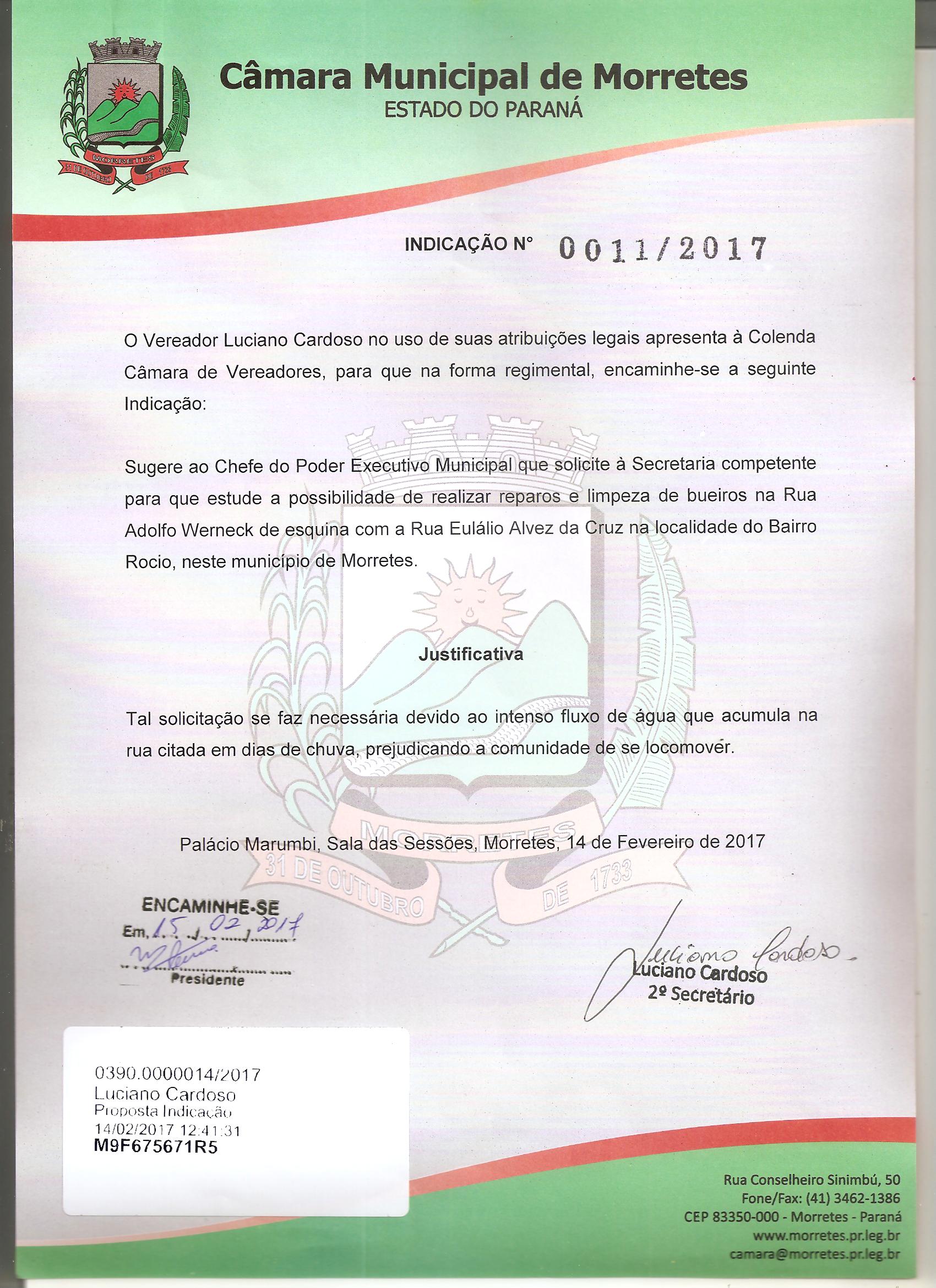 ![]() SUGERE AO CHEFE DO PODER EXECUTIVO MUNICIPAL QUE SOLICITE À SECRETARIA COMPETENTE PARA QUE ESTUDE A POSSIBILIDADE DE REALIZAR REPAROS E LIMPEZA DE BUEIROS NA RUA ADOLFO WERNECK DE ESQUINA COM A RUA EULÁLIO ALVEZ DA CRUZ NA LOCALIDADE DO BAIRRO ROCIO,NESTE MUNICÍPIO DE MORRETES .