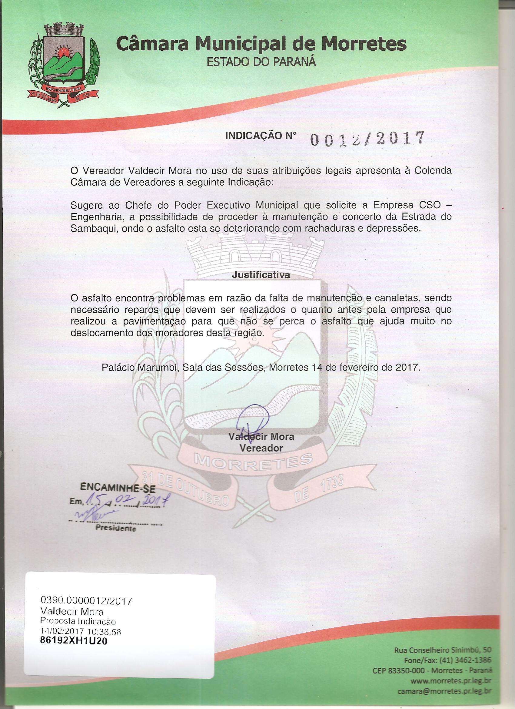 ![]() SUGERE AO CHEFE DO PODER EXECUTIVO MUNICIPAL QUE SOLICITE A EMPRESA CSO-ENGENHARIA ,A POSSIBILIDADE DE PROCEDER À MANUTENÇÃO E CONCERTO DA ESTRADA DO SAMBAQUI ,ONDE O ASFALTO ESTA SE DETERIORANDO COM RACHADURAS E DEPRESSÕES .