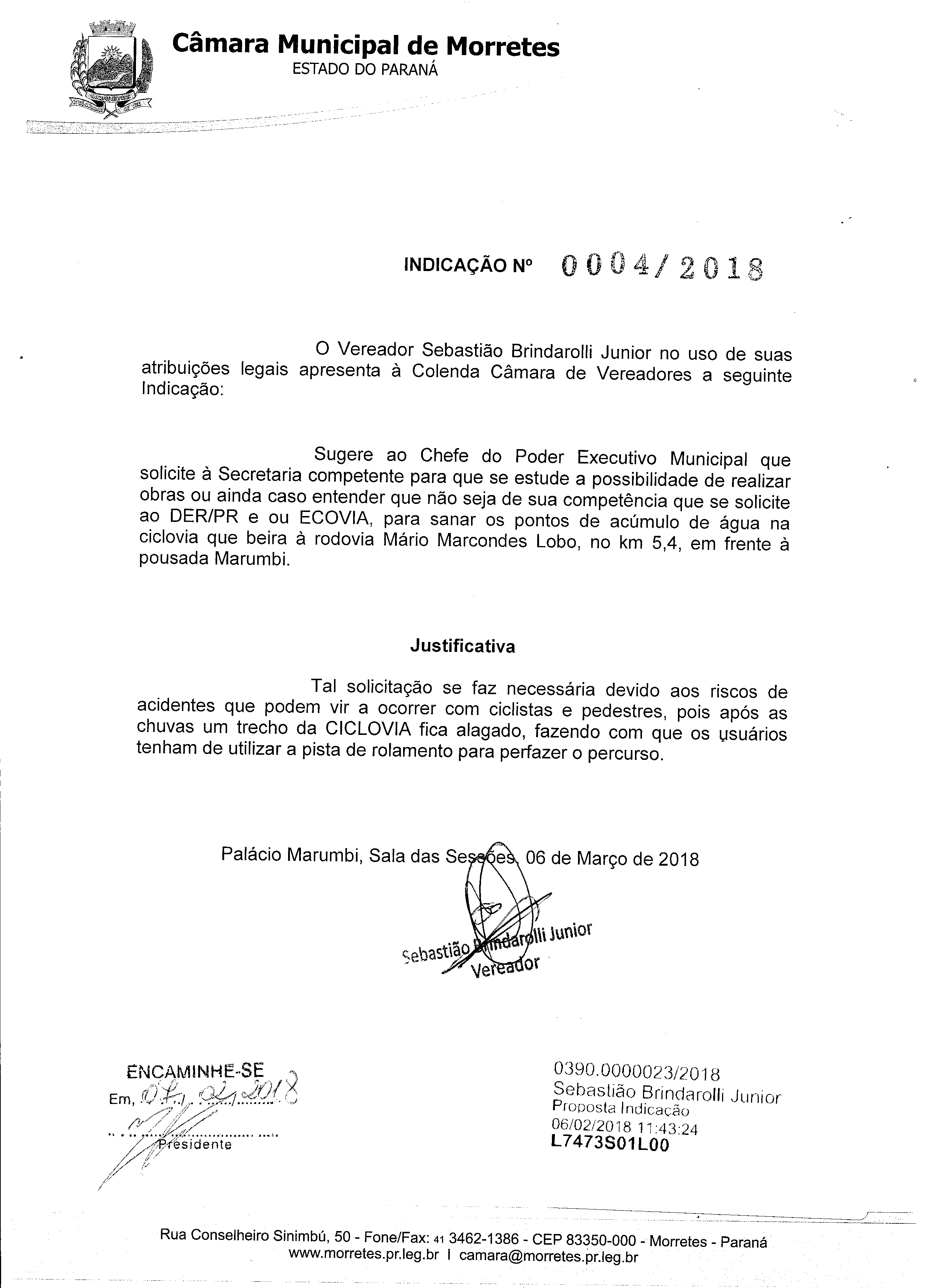 Ementa: SUGERE AO CHEFE DO PODER EXECUTIVO MUNICIPAL QUE SOLICITE À SECRETARIA COMPETENTE PARA QUE ESTUDE A POSSIBILIDADE DE REALIZAR OBRAS OU AINDA CASO ATENDER QUE NÃO SEJA DE SUA COMPETÊNCIA QUE SE SOLICITE AO DER/PR E OU ECOVIA, PARA SANAR OS PONTOS DE ACÚMULO DE ÁGUA NA CICLOVIA QUE BEIRA À RODOVIA MÁRIO MARCONDES LOBO, NO KM 5,4, EM FRENTE À POUSADA MARUMBI.