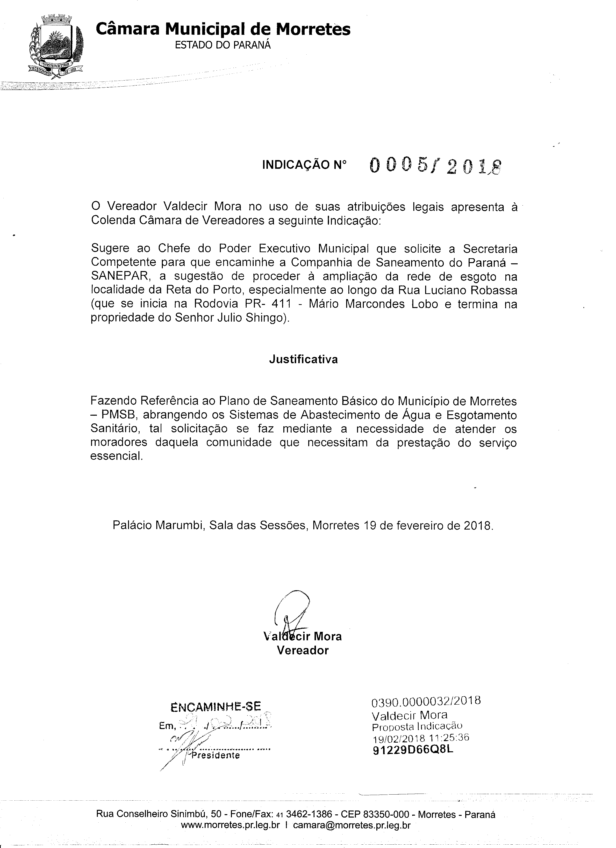 Ementa: SUGERE AO CHEFE DO PODER EXECUTIVO MUNICIPAL QUE SOLICITE A SECRETARIA COMPETENTE PARA QUE ENCAMINHE A COMPANHIA DE SANEAMENTO DO PARANÁ- SANEPAR, A SUGESTÃO DE PROCEDER Á AMPLIAÇÃO DA REDE DE ESGOTO NA LOCALIDADE DA RETA DO PORTO, ESPACIALMENTE AO LONGO DA RUA DA RUA LUCIANO ROBASSA ( QUE SE INICIA NA RODOVIA PR 411 - MÁRIO MARCONDES LOBO E TERMINA NA PROPRIEDADE DO SENHOR JÚLIO SHINGO).