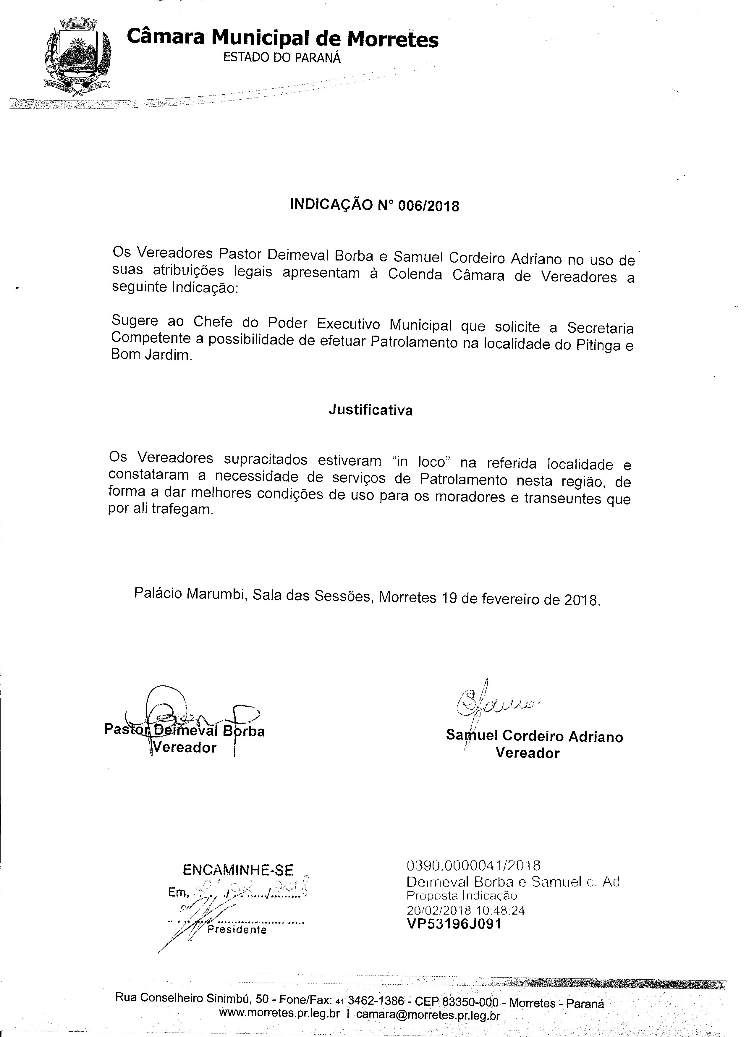 Ementa: SUGERE AO CHEFE DO PODER EXECUTIVO MUNICIPAL QUE SOLICITE A SECRETARIA COMPETENTE A POSSIBILIDADE DE EFETUAR PATROLAMENTO NA LOCALIDADE DO PITINGA E BOM JARDIM.