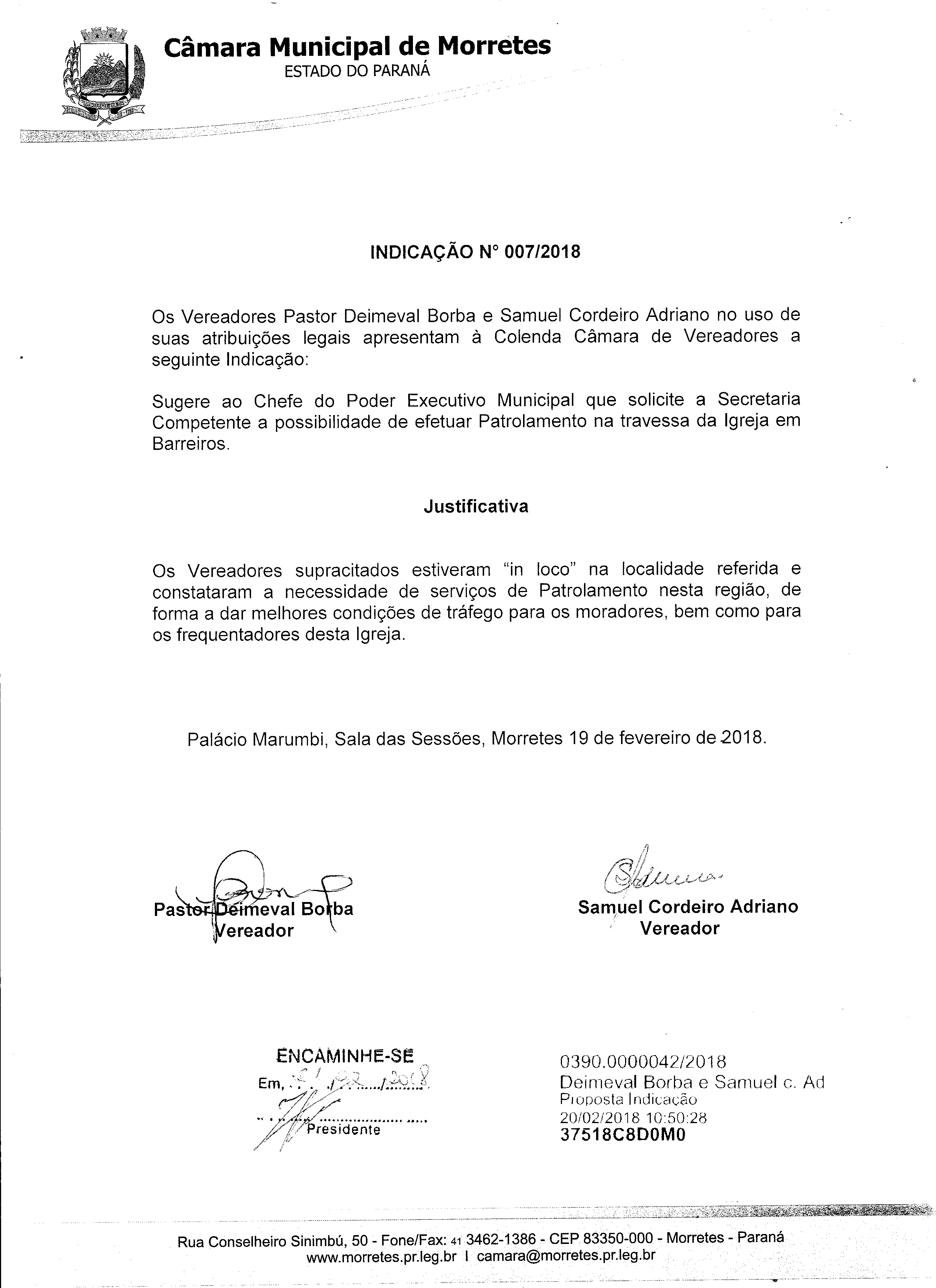 Ementa: SUGERE AO CHEFE DO PODER EXECUTIVO MUNICIPAL QUE SOLICITE A SECRETARIA COMPETENTE A POSSIBILIDADE EFETUAR PATROLAMENTO NA TRAVESSA DA IGREJA EM