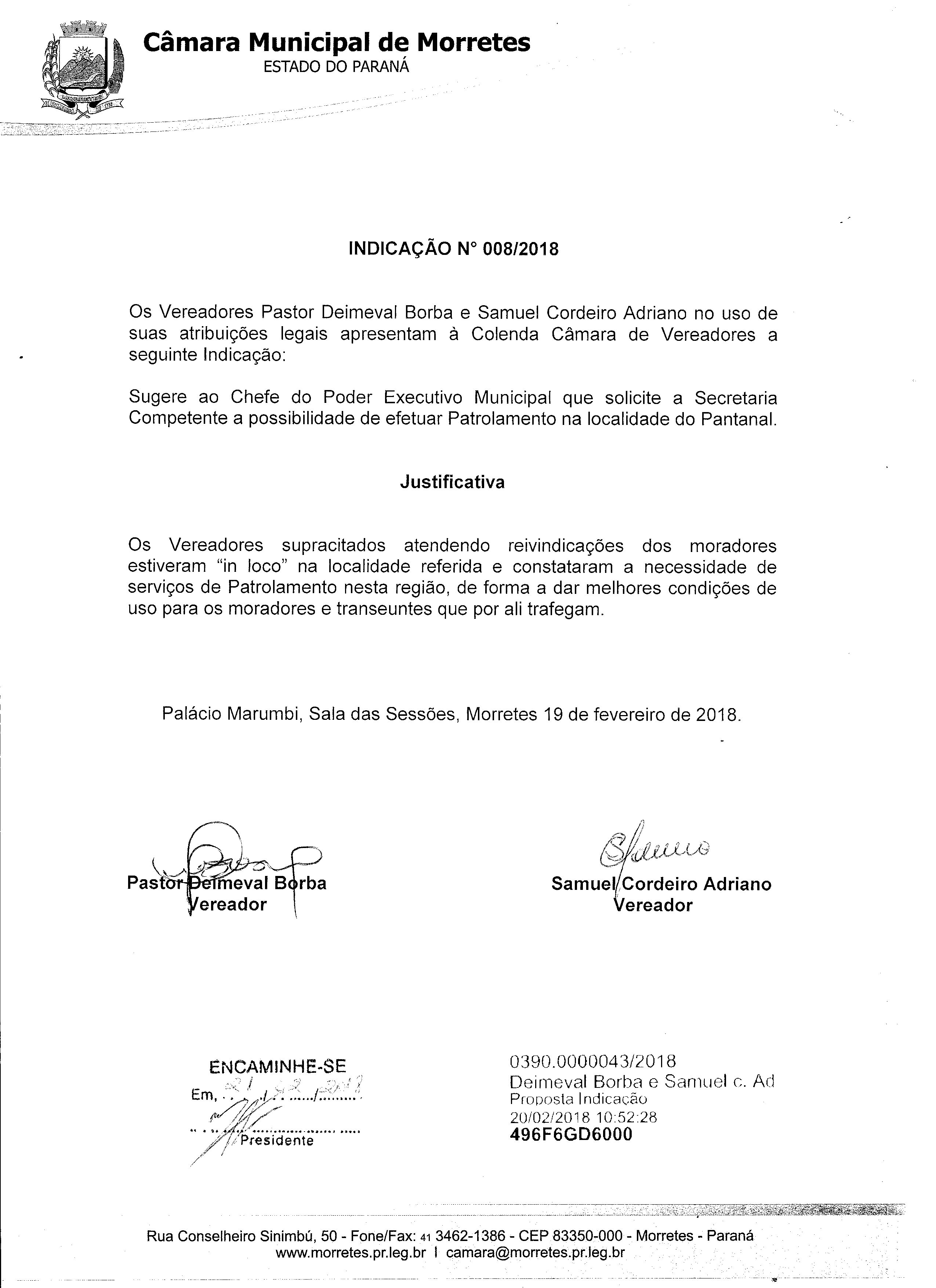 Ementa: SUGERE AO CHEFE DO PODER EXECUTIVO MUNICIPAL QUE SOLICITE A SECRETARIA COMPETENTE A POSSIBILIDADE DE EFETUAR PATROLAMENTO NA LOCALIDADE DO PANTANAL.