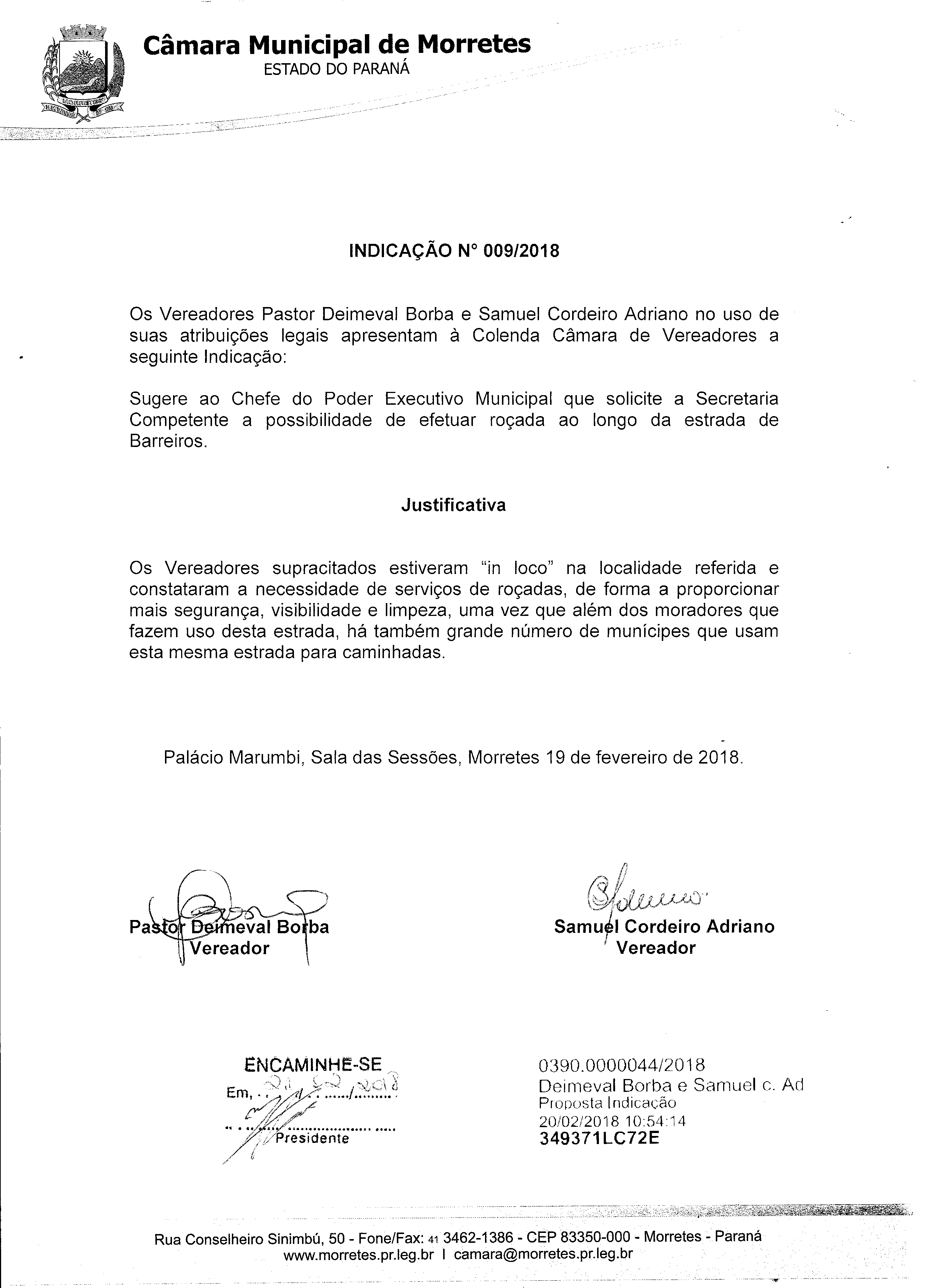 Ementa: SUGERE AO CHEFE DO PODER EXECUTIVO MUNICIPAL QUE SOLICITE A SECRETARIA COMPETENTE A POSSIBILIDADE DE EFETUAR ROÇADA AO LONGO DA ESTRADA DE BARREIROS.