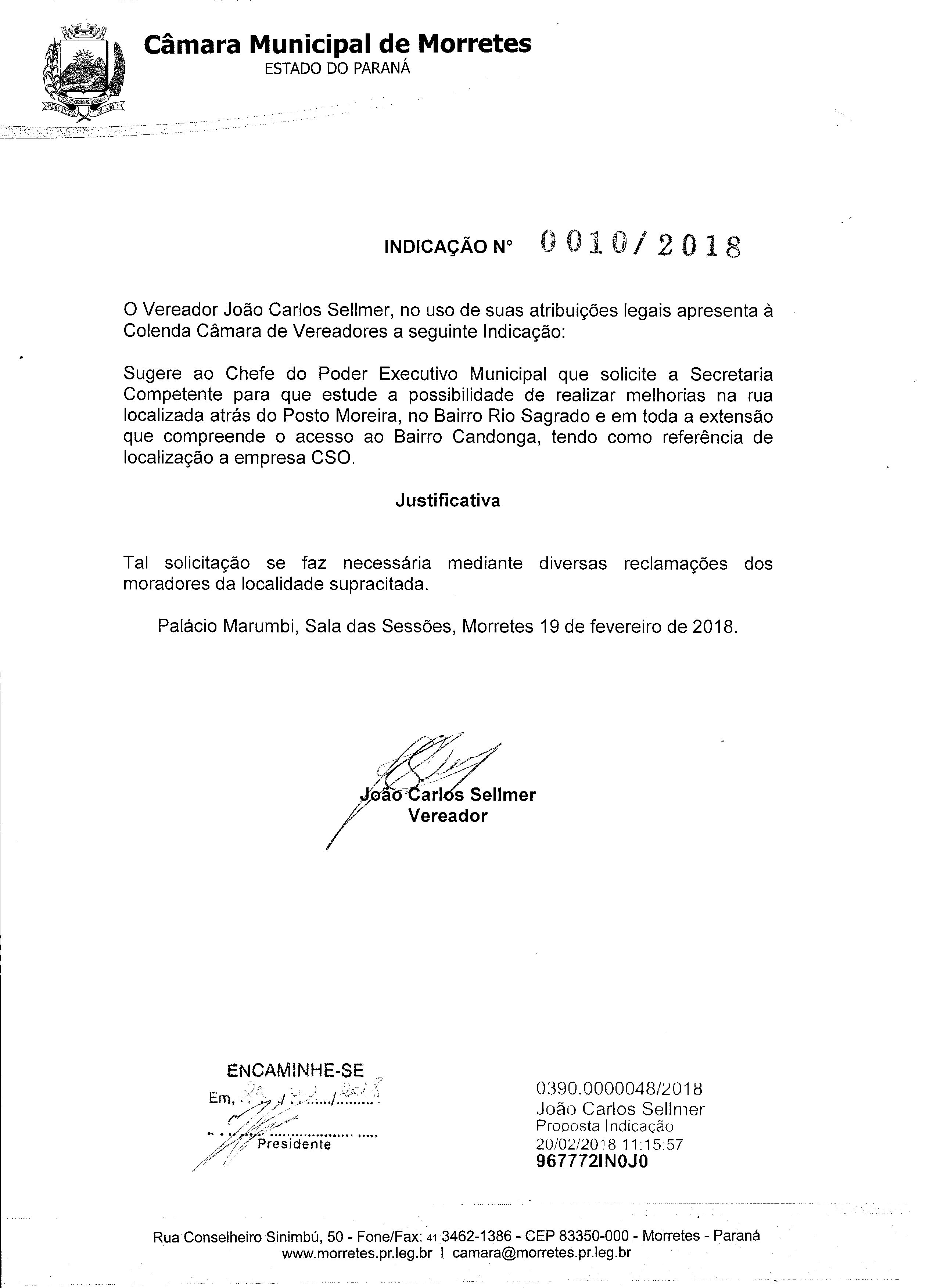 Ementa: SUGERE AO CHEFE DO PODER EXECUTIVO MUNICIPAL QUE SOLICITE A SECRETARIA COMPETENTE A POSSIBILIDADE DE REALIZAR MELHORIAS NA RUA LOCALIZADA ATRÁS DO POSTO MOREIRA, NO BAIRRO DO RIO SAGRADO E EM TODA A EXTENSÃO QUE COMPREENDE O ACESSO AO BAIRRO CANDONGA, TENDO COMO REFERÊNCIA DE LOCALIZAÇÃO A EMPRESA CSO.