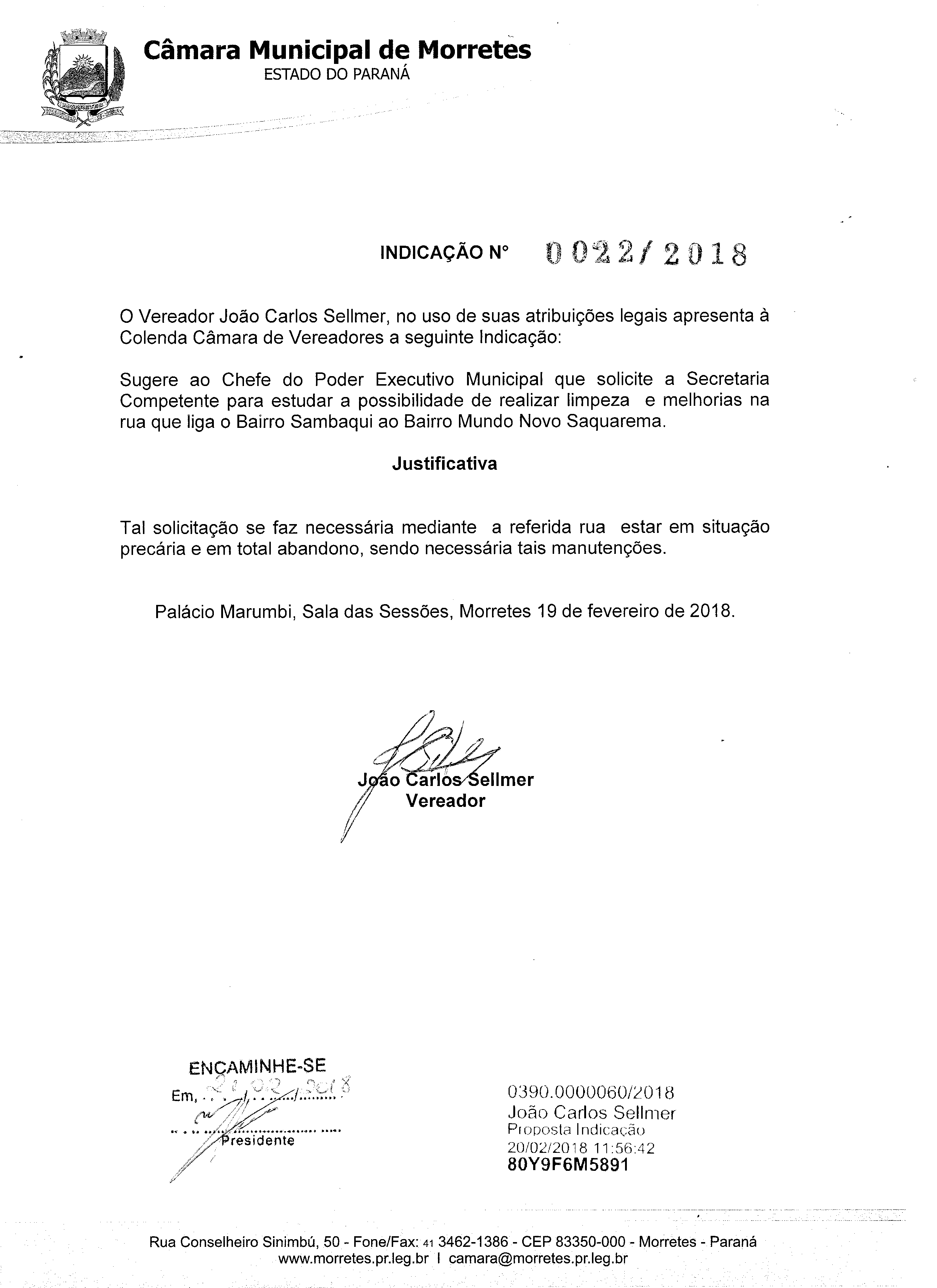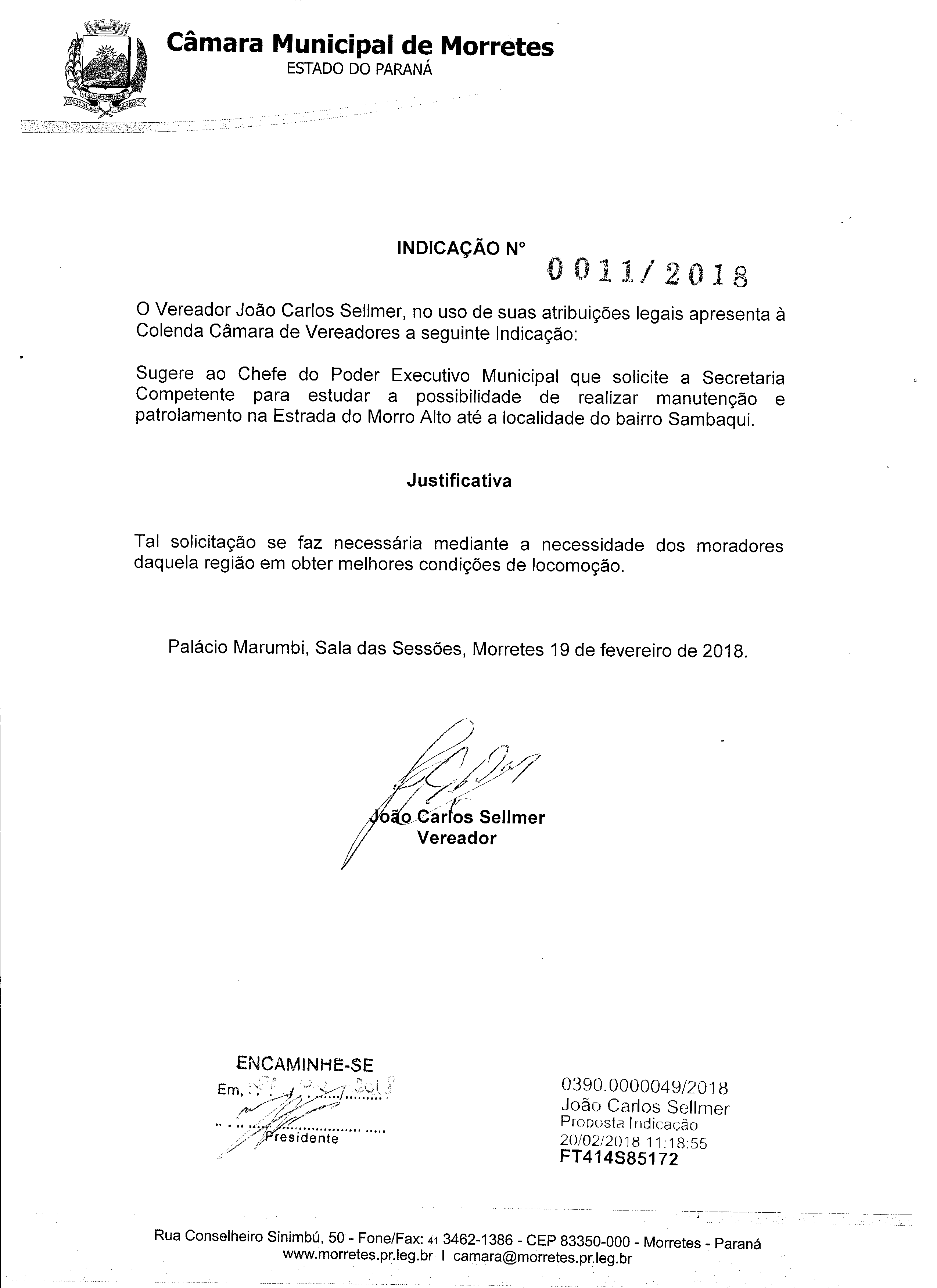 Ementa: SUGERE AO CHEFE DO PODER EXECUTIVO MUNICIPAL QUE SOLICITE A SECRETARIA COMPETENTE PARA ESTUDAR A POSSIBILIDADE DE REALIZAR MANUTENÇÃO E PATROLAMENTO NA ESTRADA DO MORRO ALTO ATÉ A LOCALIDADE DO BAIRRO SAMBAQUI.