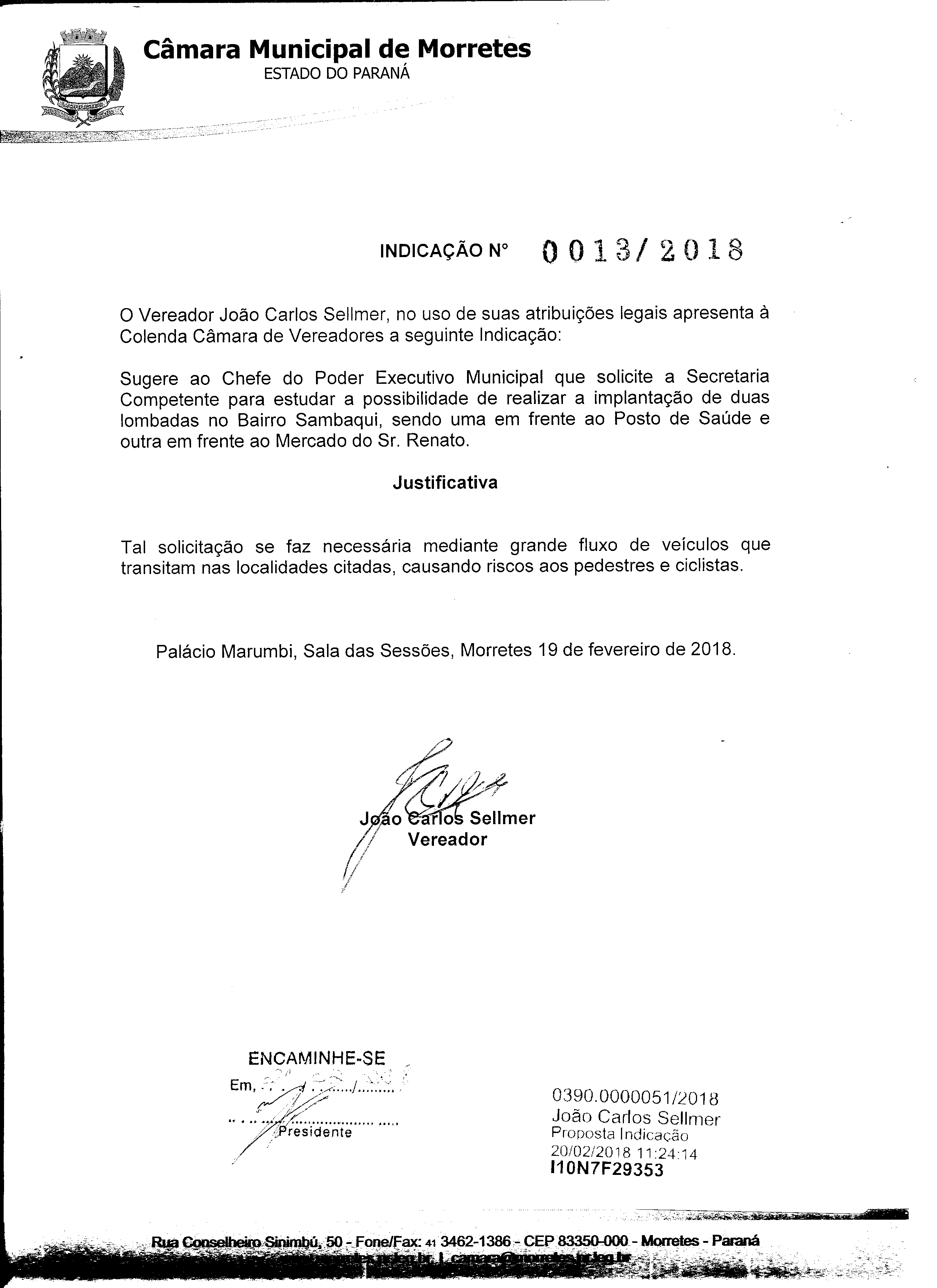 Ementa: SUGERE AO CHEFE DO PODER EXECUTIVO MUNICIPAL QUE SOLICITE A SECRETARIA COMPETENTE PARA ESTUDAR A POSSIBILIDADE DE REALIZAR A IMPLANTAÇÃO DE DUAS LOMBADAS NO BAIRRO SAMBAQUI, SENDO UMA EM FRENTE AO POSTO DE SAÚDE E OUTRA EM FRENTE AO MERCADO DO SR. RENATO.