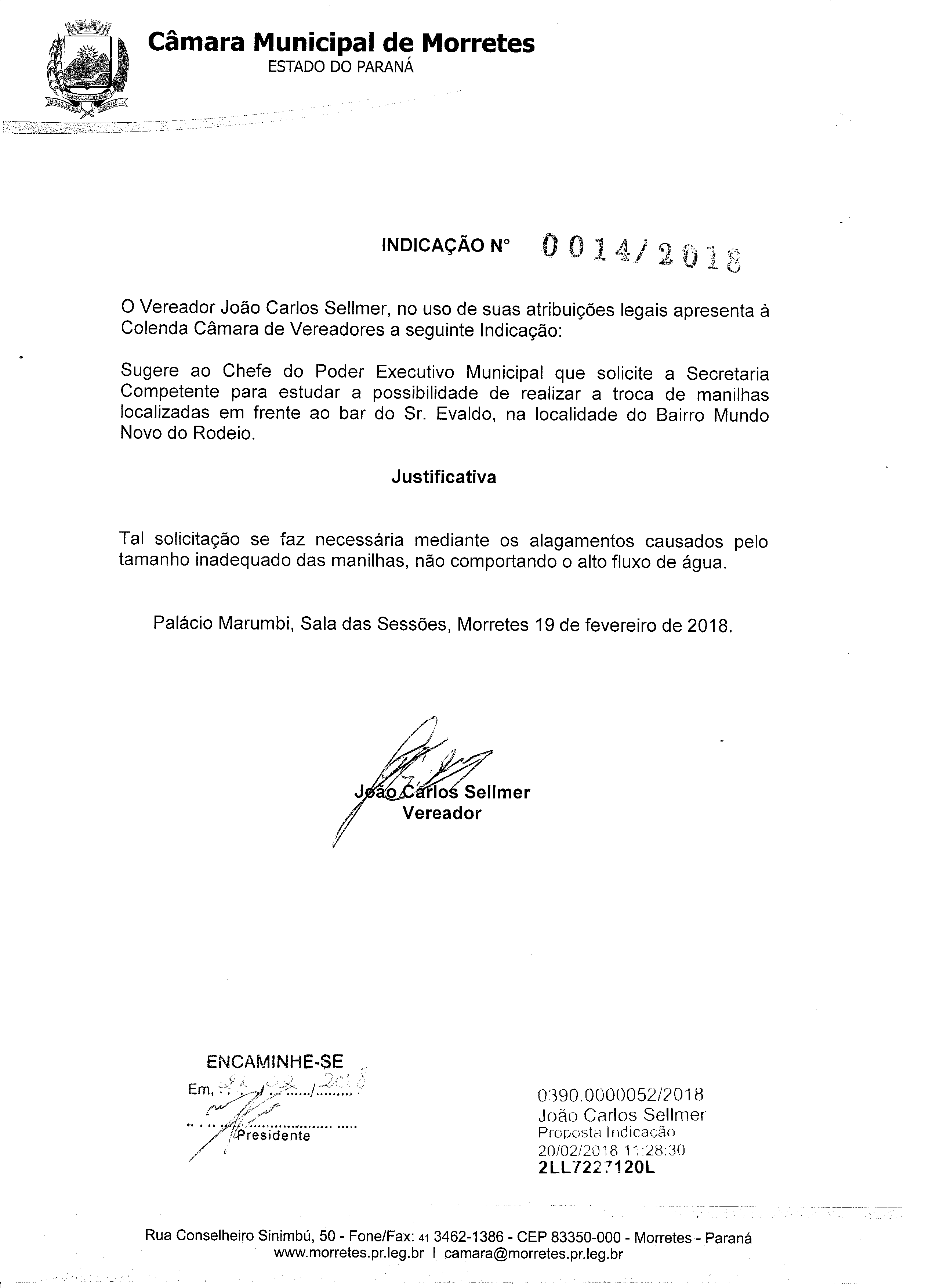 Ementa: SUGERE AO CHEFE DO PODER EXECUTIVO MUNICIPAL QUE SOLICITE A SECRETARIA COMPETENTE PARA ESTUDAR A POSSIBILIDADE DE REALIZAR A TROCA DE MANILHAS LOCALIZADAS EM FRENTE AO BAR DO SR. EVALDO, NA LOCALIDADE DO BAIRRO MUNDO NOVO DO RODEIO.