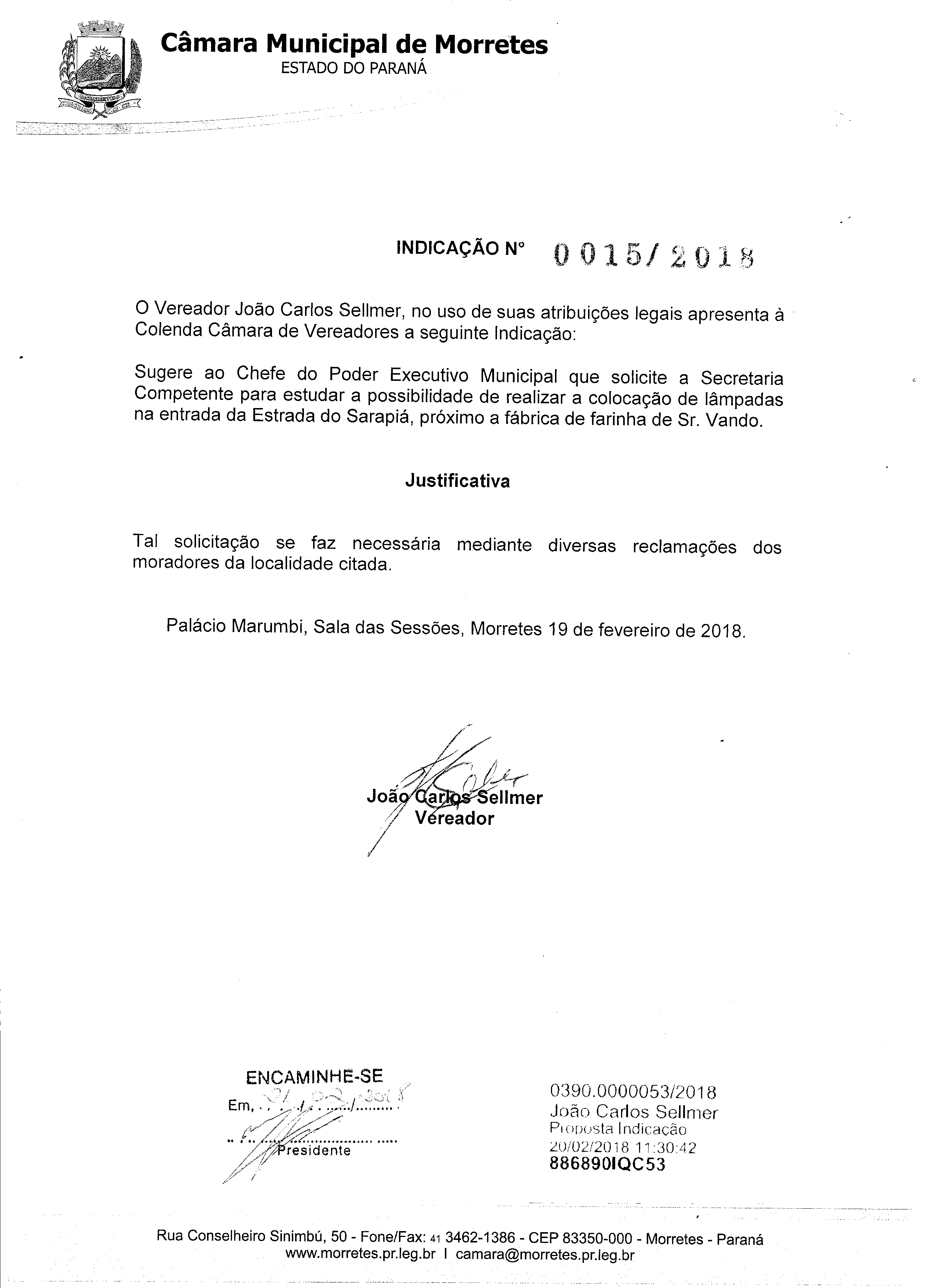 Ementa: SUGERE AO CHEFE DO PODER EXECUTIVO MUNICIPAL QUE SOLICITE A SECRETARIA COMPETENTE PARA ESTUDAR A POSSIBILIDADE DE REALIZAR A COLOCAÇÃO DE LÂMPADAS NA ENTRADA DA ESTRADA DO SARAPIÁ, PRÓXIMO A FÁBRICA DE FARINHA DE SR. VANDO.