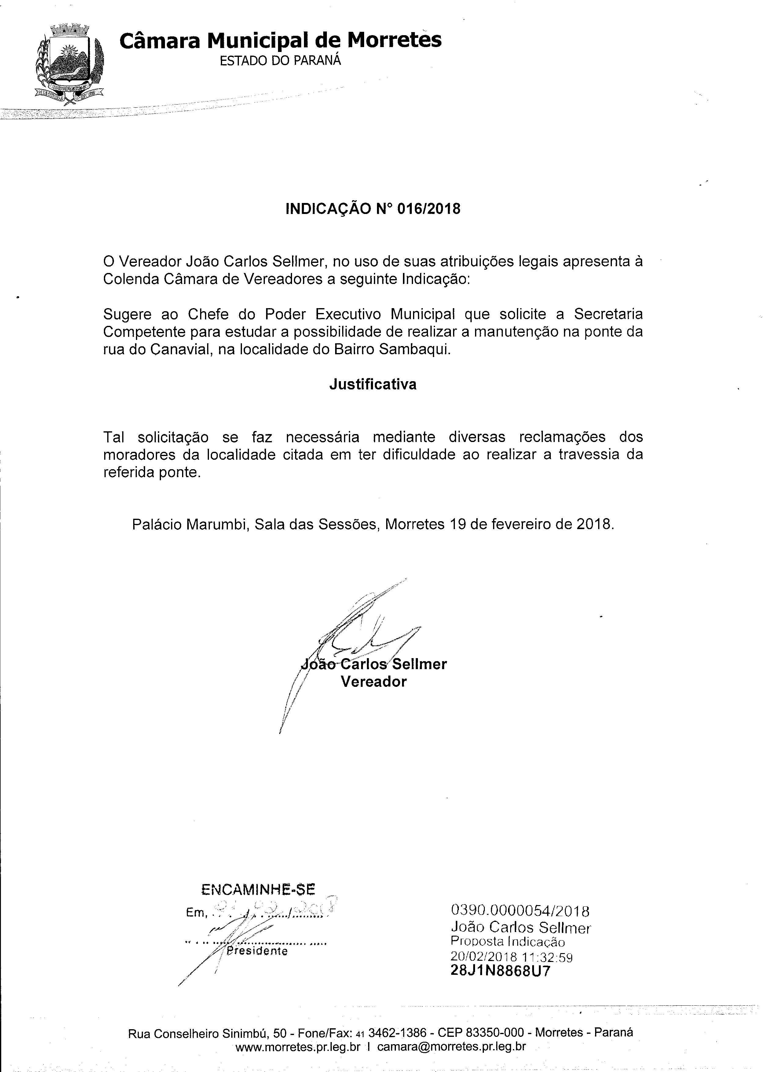 Ementa: SUGERE AO CHEFE DO PODER EXECUTIVO MUNICIPAL QUE SOLICITE A SECRETARIA COMPETENTE PARA ESTUDAR A POSSIBILIDADE DE REALIZAR A MANUTENÇÃO NA PONTE DA RUA DO CANAVIAL NA LOCALIDADE DO BAIRRO SAMBAQUI.