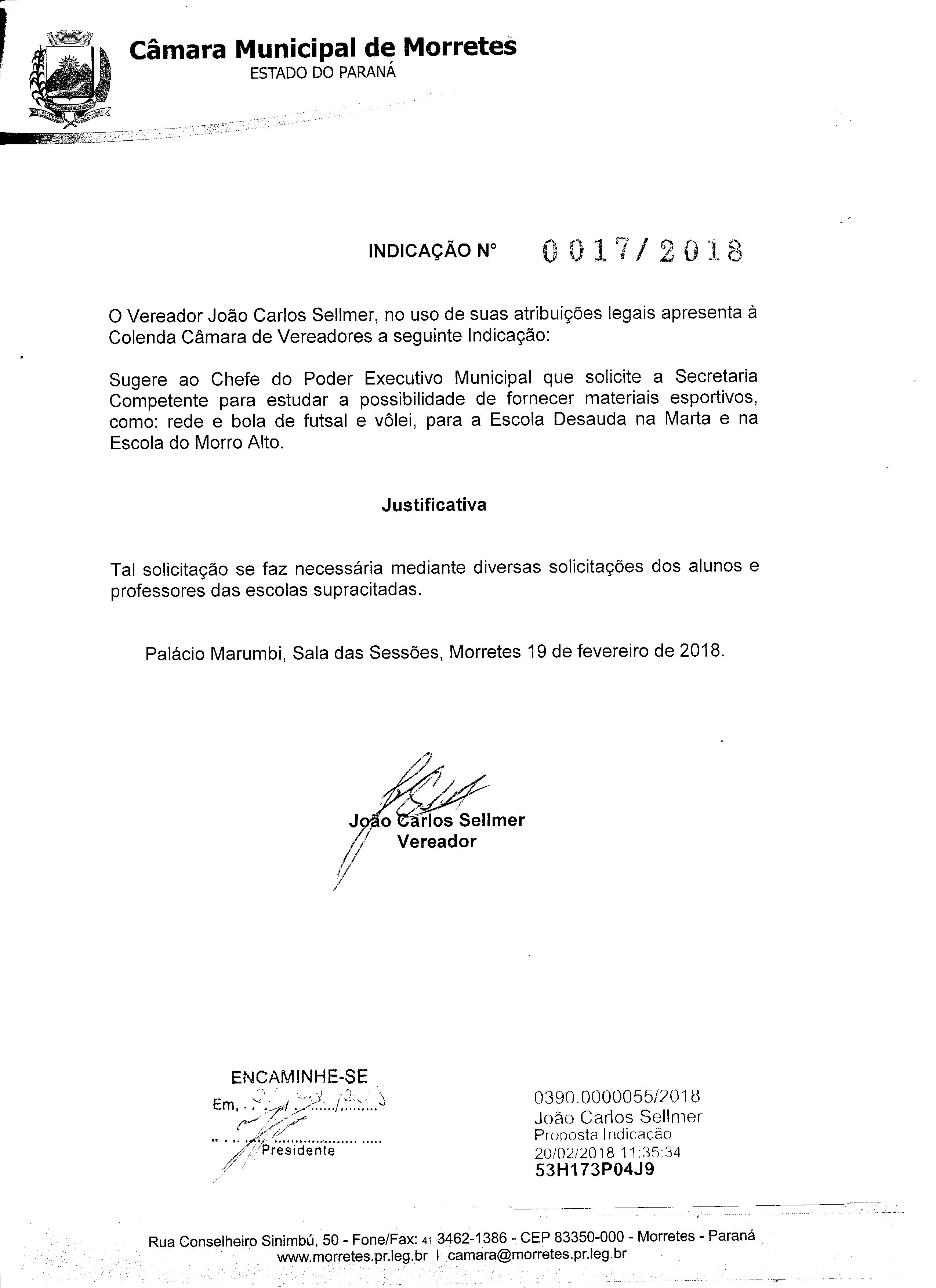 Ementa: SUGERE AO CHEFE DO PODER EXECUTIVO MUNICIPAL QUE SOLICITE A SECRETARIA COMPETENTE PARA ESTUDAR A POSSIBILIDADE DE REALIZAR DE FORNECER MATERIAIS ESPORTIVOS, COMO: REDE DE BOLA DE FUTSAL E VÔLEI, PARA A ESCOLA DESAUDA NA MARTHA E NA ESCOLA DO MORRO ALTO.