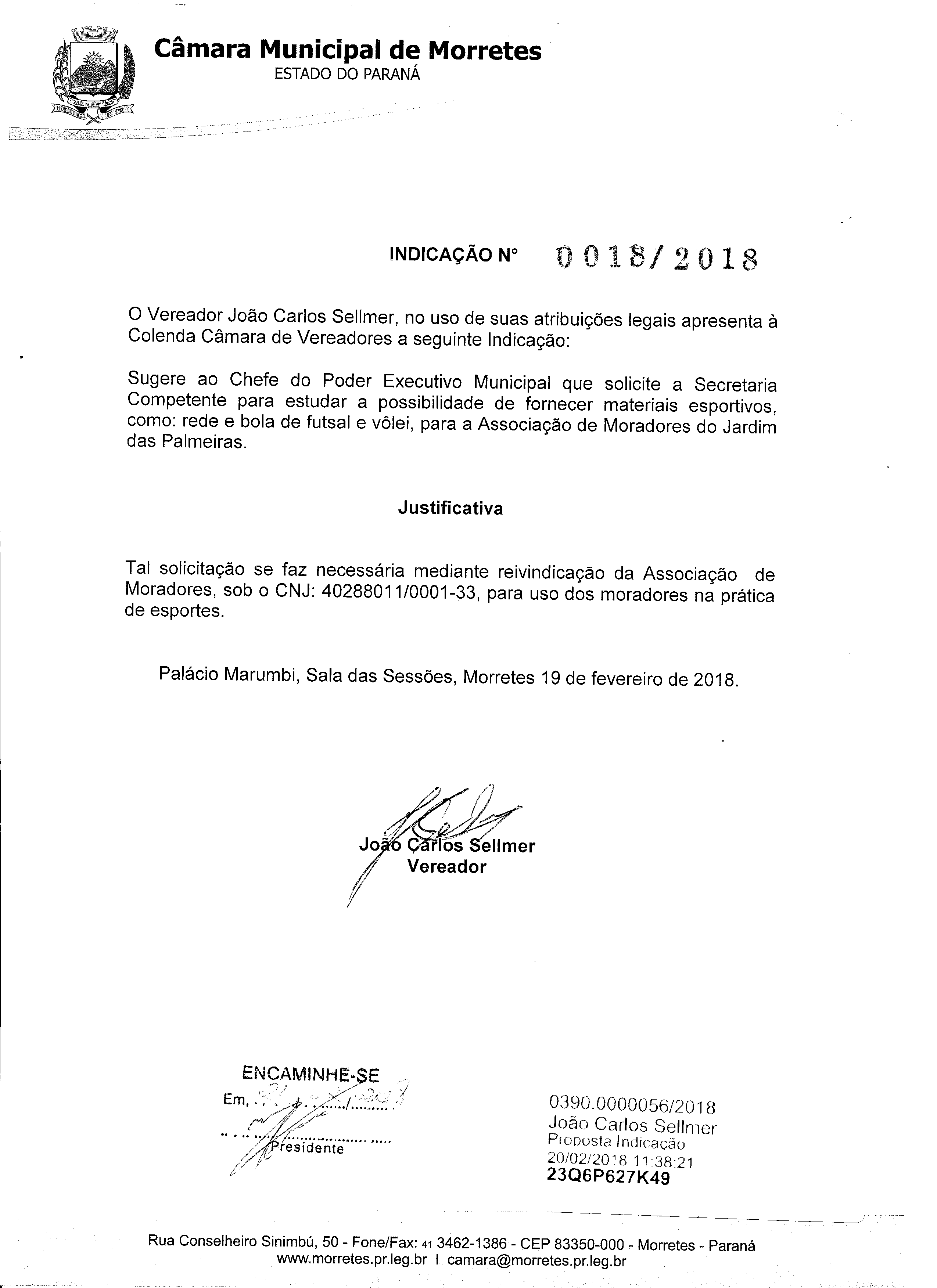 Ementa: SUGERE AO CHEFE DO PODER EXECUTIVO MUNICIPAL QUE SOLICITE A SECRETARIA COMPETENTE PARA ESTUDAR A POSSIBILIDADE DE FORNECER MATERIAIS ESPORTIVOS COMO: REDE E BOLA DE FUTSAL E VÔLEI, PARA A ASSOCIAÇÃO DE MORADORES DO JARDIM DAS PALMEIRAS.