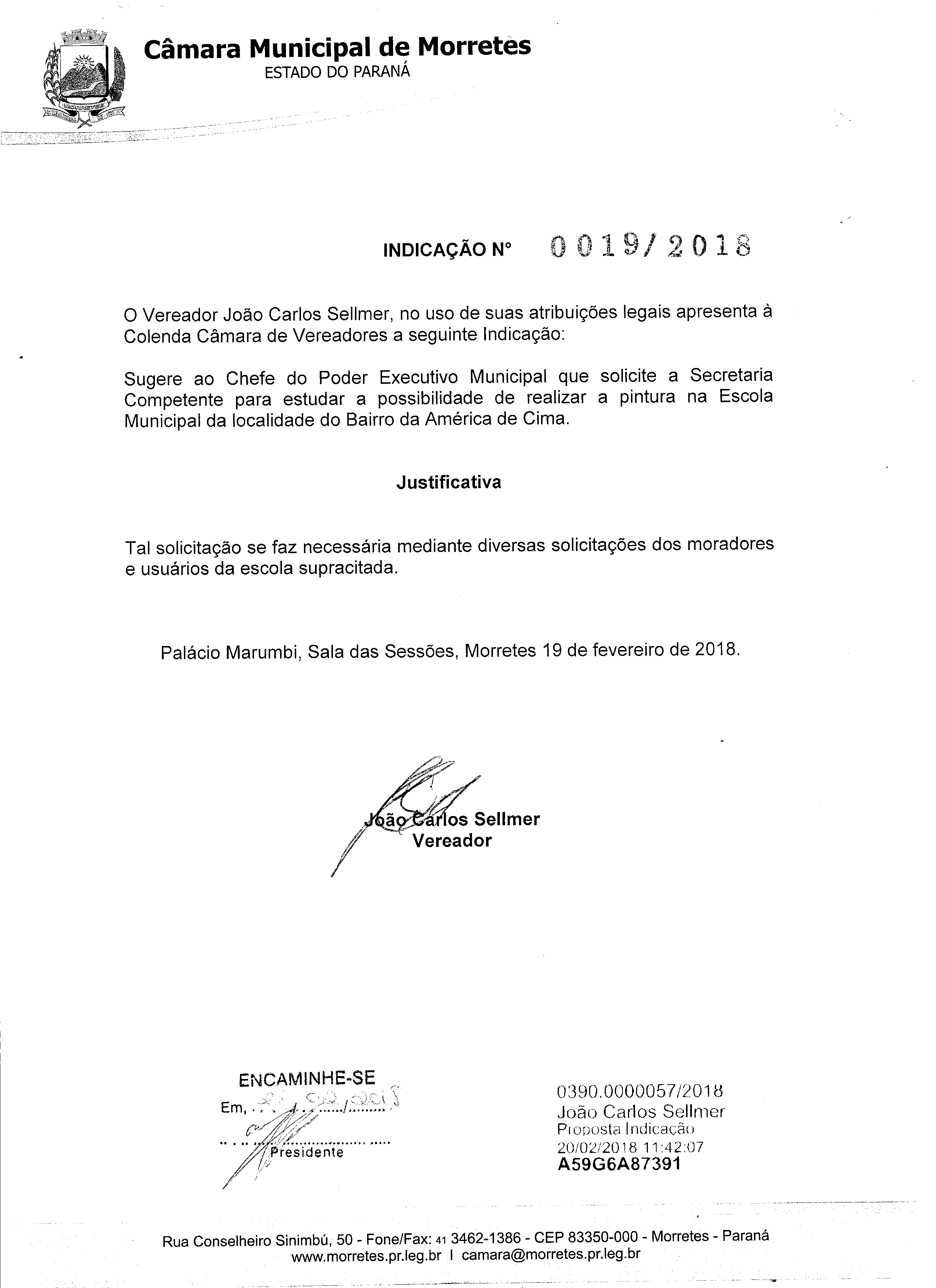 Ementa: SUGERE AO CHEFE DO PODER EXECUTIVO MUNICIPAL QUE SOLICITE A SECRETARIA COMPETENTE PARA ESTUDAR A POSSIBILIDADE DE REALIZAR A PINTURA NA ESCOLA MUNICIPAL DA LOCALIDADE DO BAIRRO DA AMÉRICA DE CIMA.