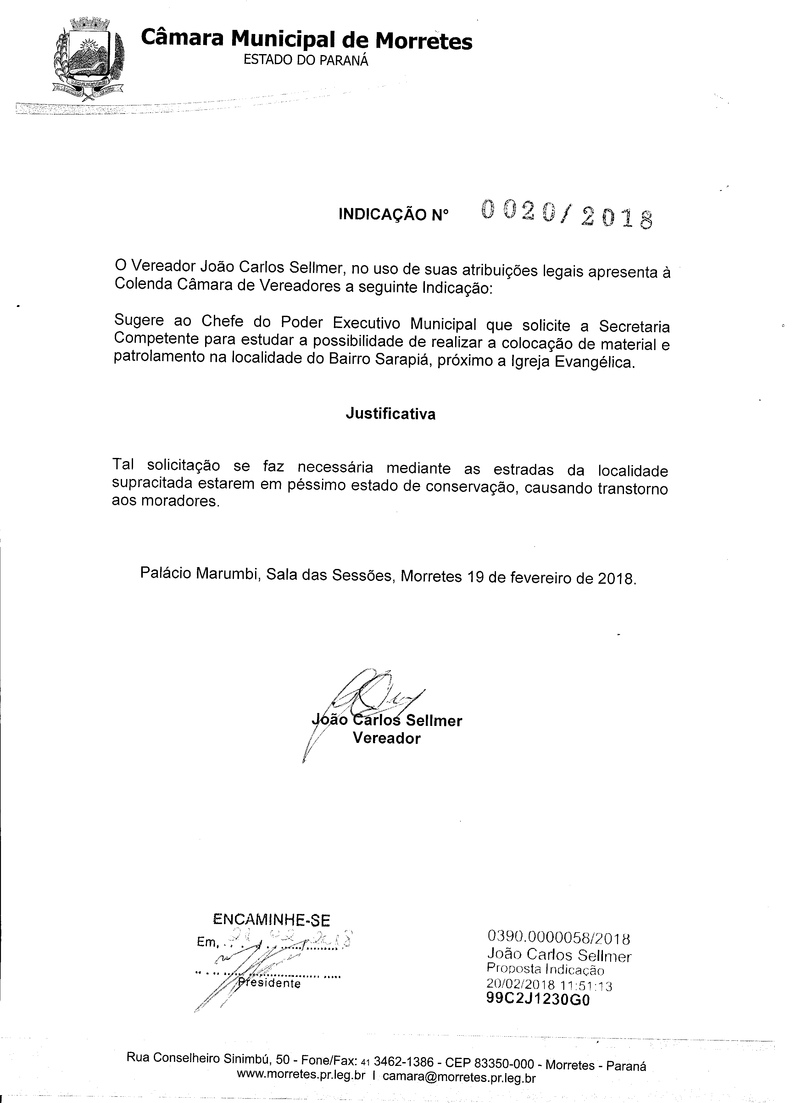 Ementa: SUGERE AO CHEFE DO PODER EXECUTIVO MUNICIPAL QUE SOLICITE A SECRETARIA COMPETENTE PARA ESTUDAR A POSSIBILIDADE DE REALIZAR A COLOCAÇÃO DE MATERIAL E PATROLAMENTO NA LOCALIDADE DO BAIRRO SARAPIÁ PRÓXIMO A IGREJA EVANGÉLICA.
