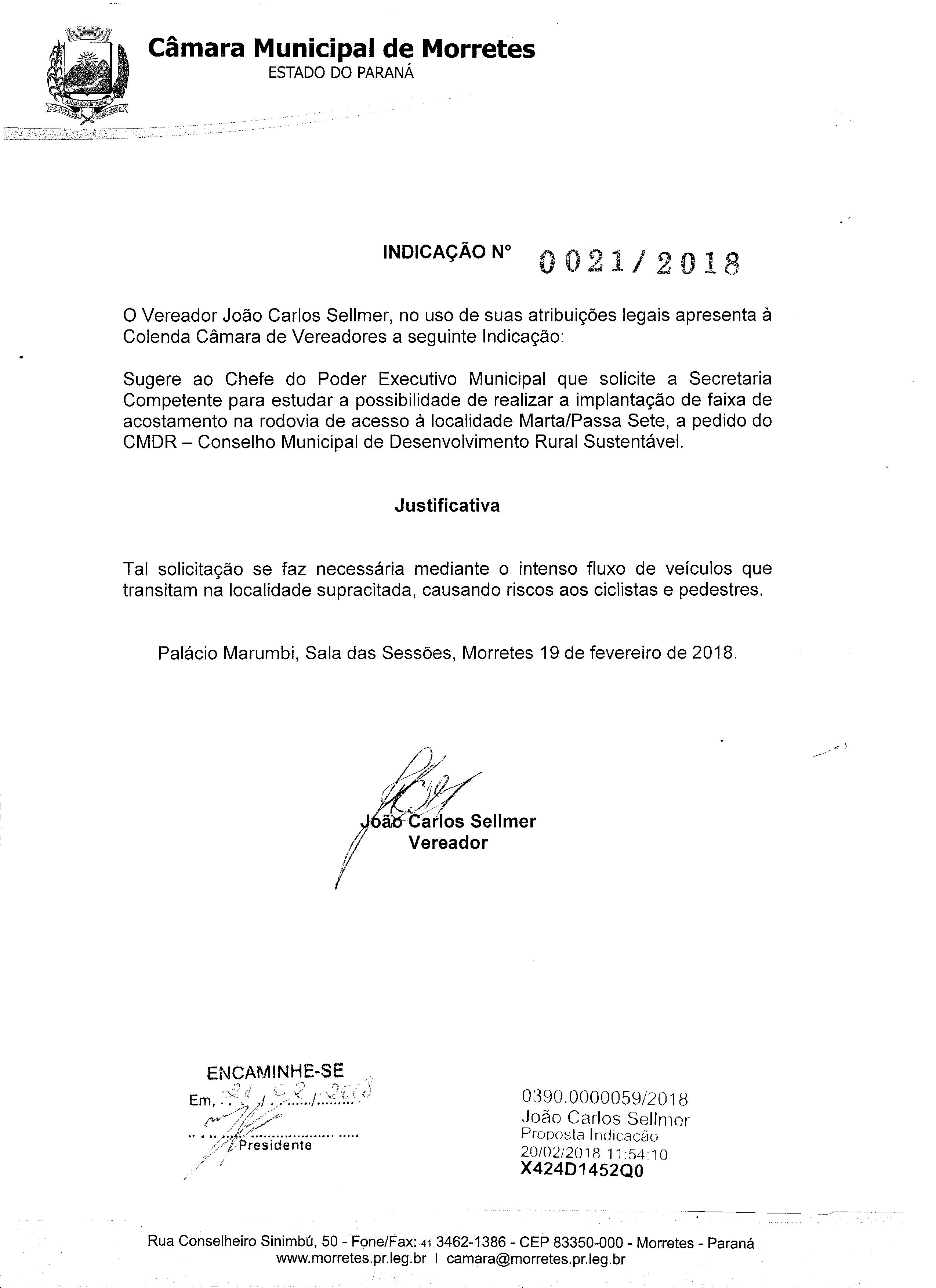 Ementa: SUGERE AO CHEFE DO PODER EXECUTIVO MUNICIPAL QUE SOLICITE A SECRETARIA COMPETENTE PARA ESTUDAR A POSSIBILIDADE DE REALIZAR A IMPLANTAÇÃO DE FAIXA DE ACOSTAMENTO NA RODOVIA DE ACESSO Á LOCALIDADE MARTHA/ PASSA SETE , A PEDIDO DO CMDR- CONSELHO MUNICIPAL DE DESENVOLVIMENTO RURAL SUSTENTÁVEL.