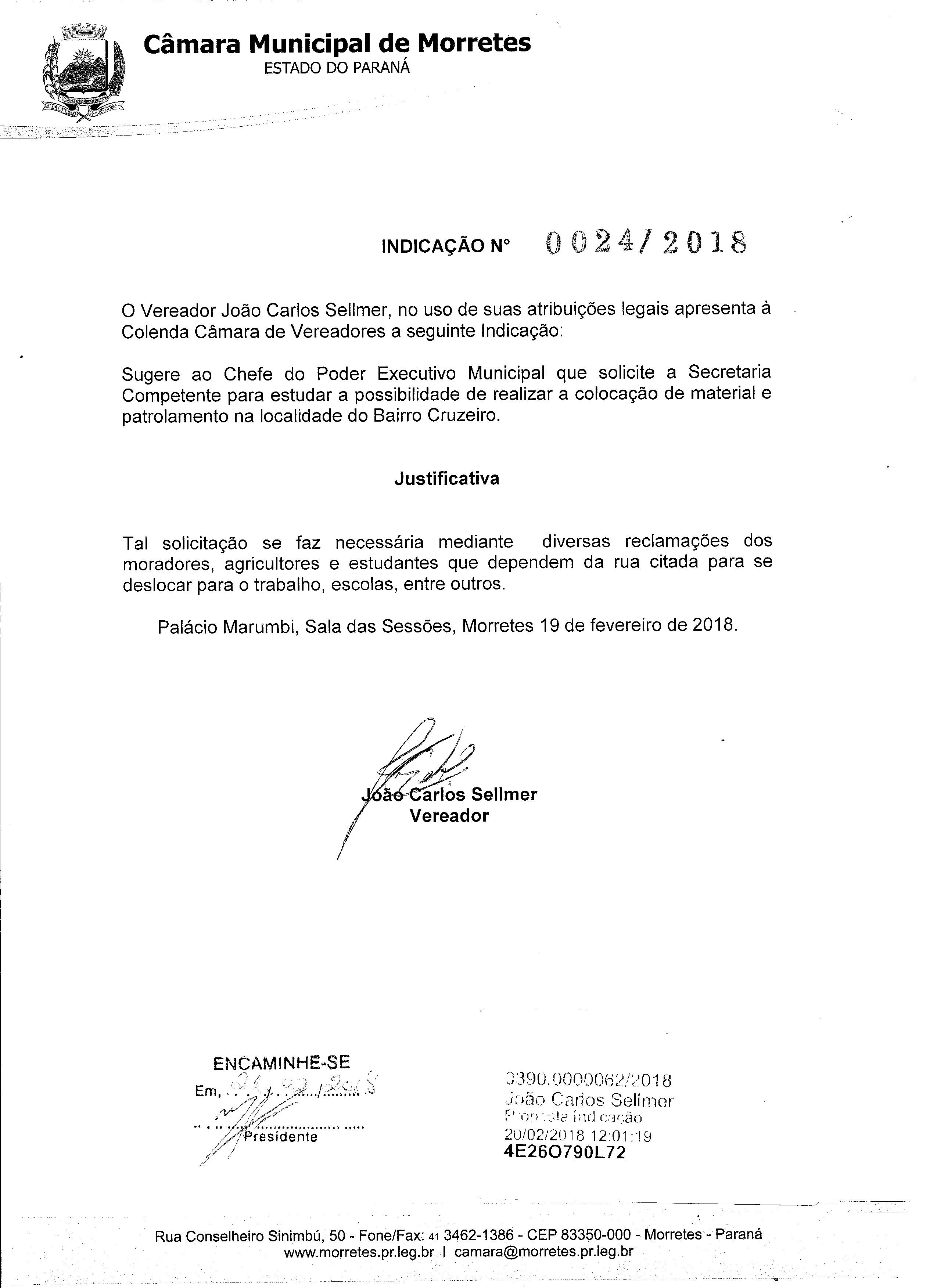 Ementa: SUGERE AO CHEFE DO PODER EXECUTIVO MUNICIPAL QUE SOLICITE A SECRETARIA COMPETENTE PARA ESTUDAR A POSSIBILIDADE DE REALIZAR A COLOCAÇÃO DE MATERIAL E PATROLAMENTO NA LOCALIDADE DO BAIRRO CRUZEIRO.