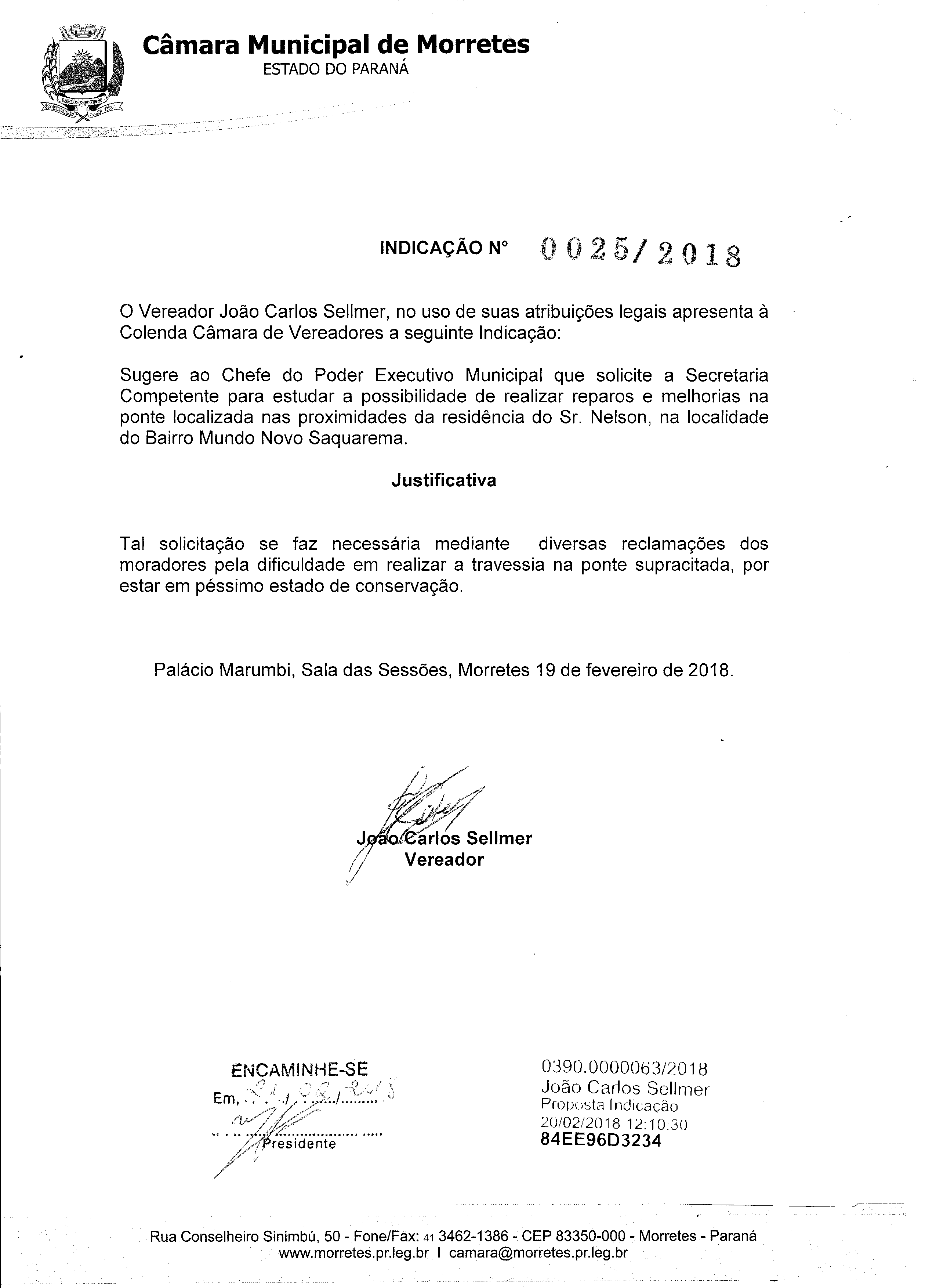 Ementa: SUGERE AO CHEFE DO PODER EXECUTIVO MUNICIPAL QUE SOLICITE A SECRETARIA COMPETENTE PARA ESTUDAR A POSSIBILIDADE DE REALIZAR REPAROS E MELHORIAS NA PONTE LOCALIZADA NAS PROXIMIDADES DA RESIDÊNCIA DO SR. NELSON, NA LOCALIDADE DO BAIRRO MUNDO NOVO SAQUAREMA.