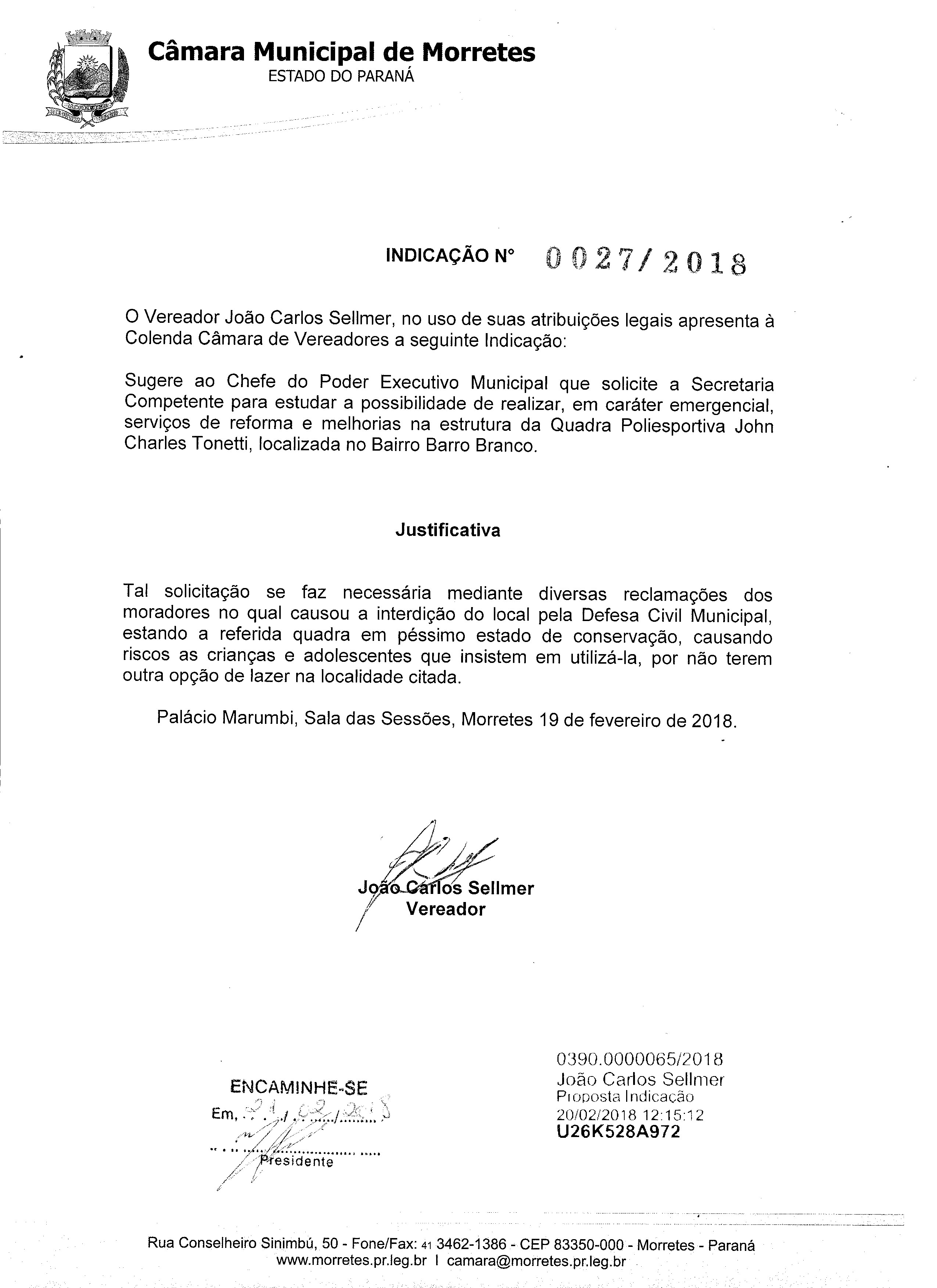 Ementa: SUGERE AO CHEFE DO PODER EXECUTIVO MUNICIPAL QUE SOLICITE A SECRETARIA COMPETENTE PARA ESTUDAR A POSSIBILIDADE DE REALIZAR, EM CARÁTER EMERGENCIAL, SERVIÇOS DE REFORMA E MELHORIAS NA ESTRUTURA DA QUADRA POLIESPORTIVA JOHN CHARLES TONETTI, LOCALIZADA NO BAIRRO BARRO BRANCO.