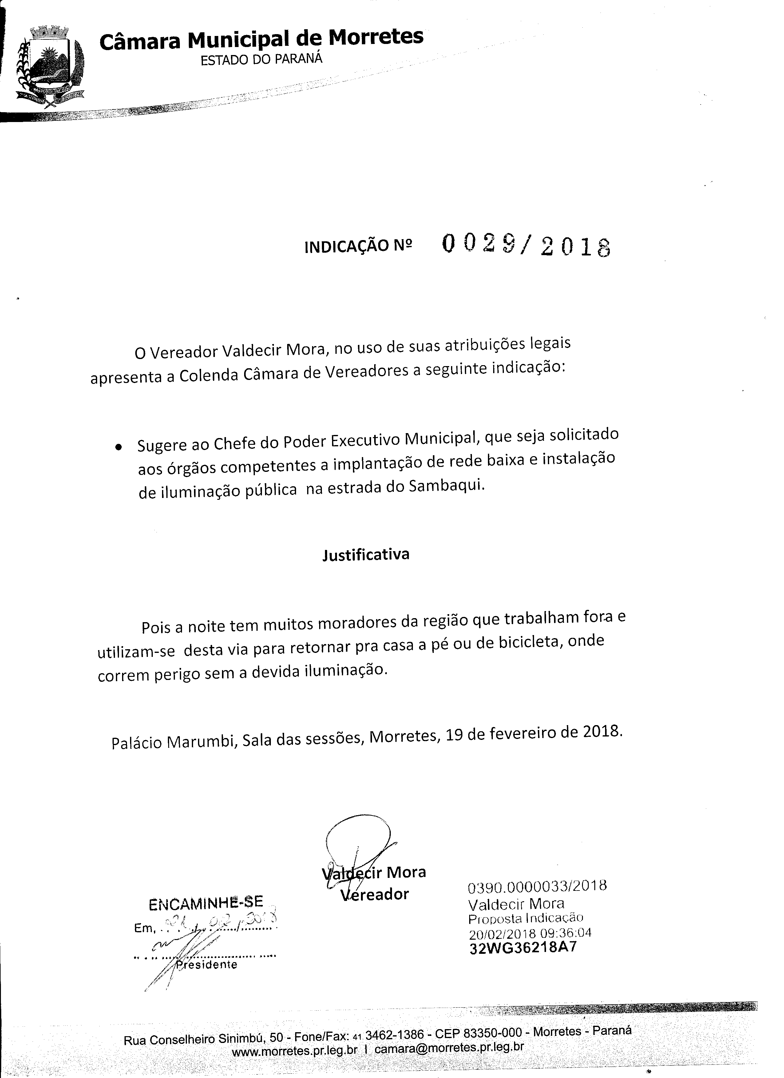 Ementa: SUGERE AO CHEFE DO PODER EXECUTIVO MUNICIPAL QUE SOLICITE A SECRETARIA COMPETENTE PARA ESTUDAR A POSSIBILIDADE DE REALIZAR A IMPLANTAÇÃO DE REDE BAIXA E INSTALAÇÃO DE ILUMINAÇÃO PÚBLICA NA ESTRADA DO SAMBAQUI.