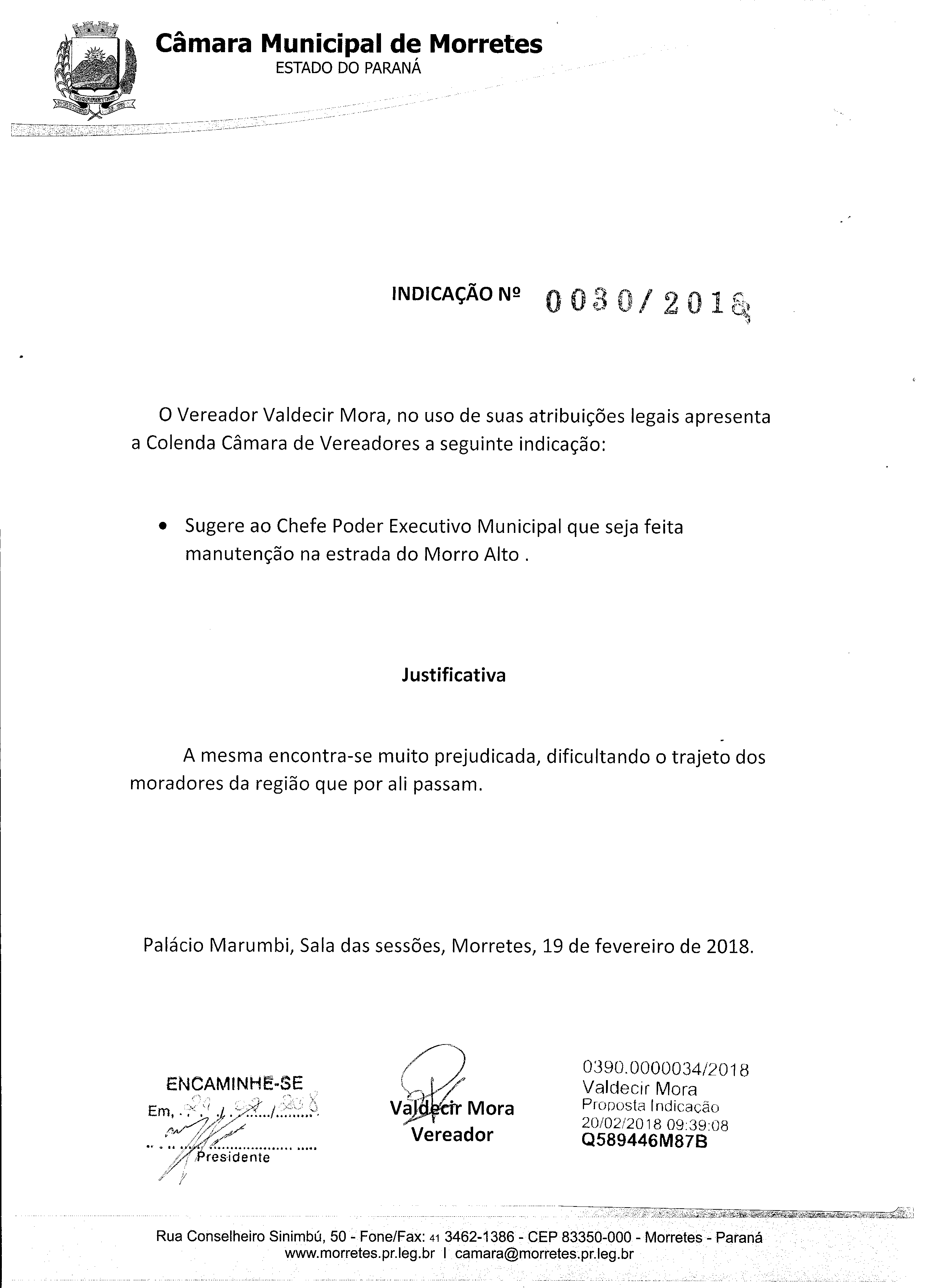 Ementa: SUGERE AO CHEFE DO PODER EXECUTIVO MUNICIPAL QUE SOLICITE A SECRETARIA COMPETENTE PARA ESTUDAR A POSSIBILIDADE DE REALIZAR A MANUTENÇÃO NA ESTRADA DO MORRO ALTO.