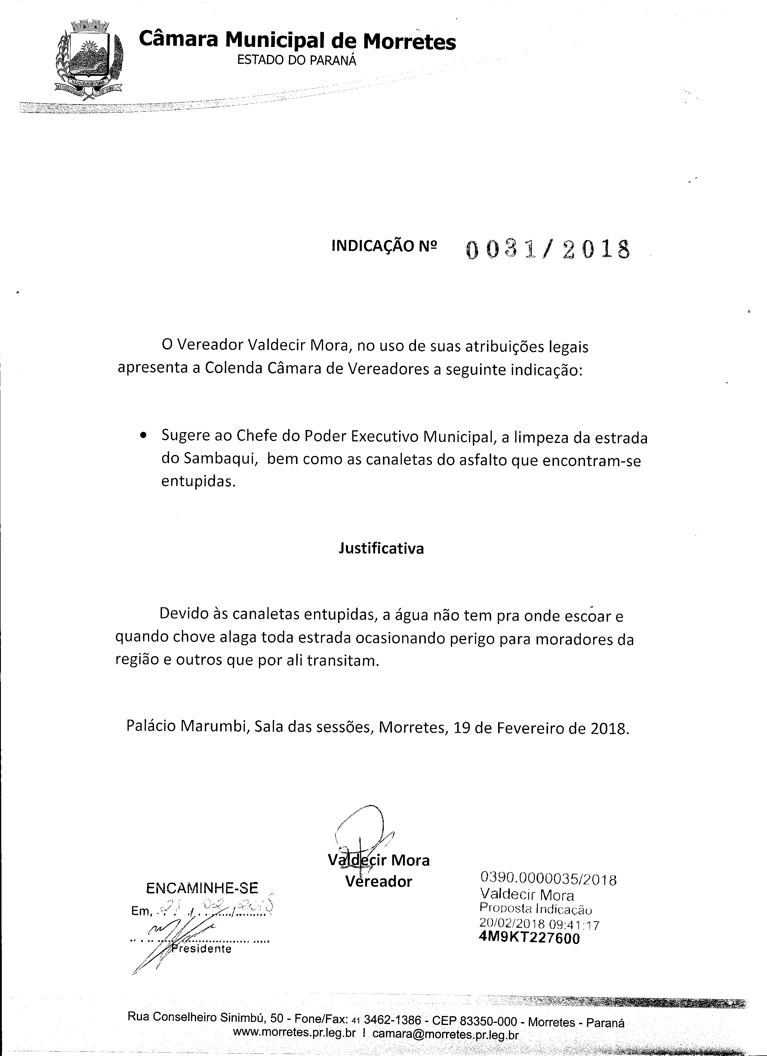 Ementa: SUGERE AO CHEFE DO PODER EXECUTIVO MUNICIPAL QUE SOLICITE A SECRETARIA COMPETENTE PARA ESTUDAR A POSSIBILIDADE DE REALIZAR A LIMPEZA DA ESTRADA DO SAMBAQUI, BEM COMO AS CANALETAS DO ASFALTO QUE ENCONTRAM - SE ENTUPIDAS.
