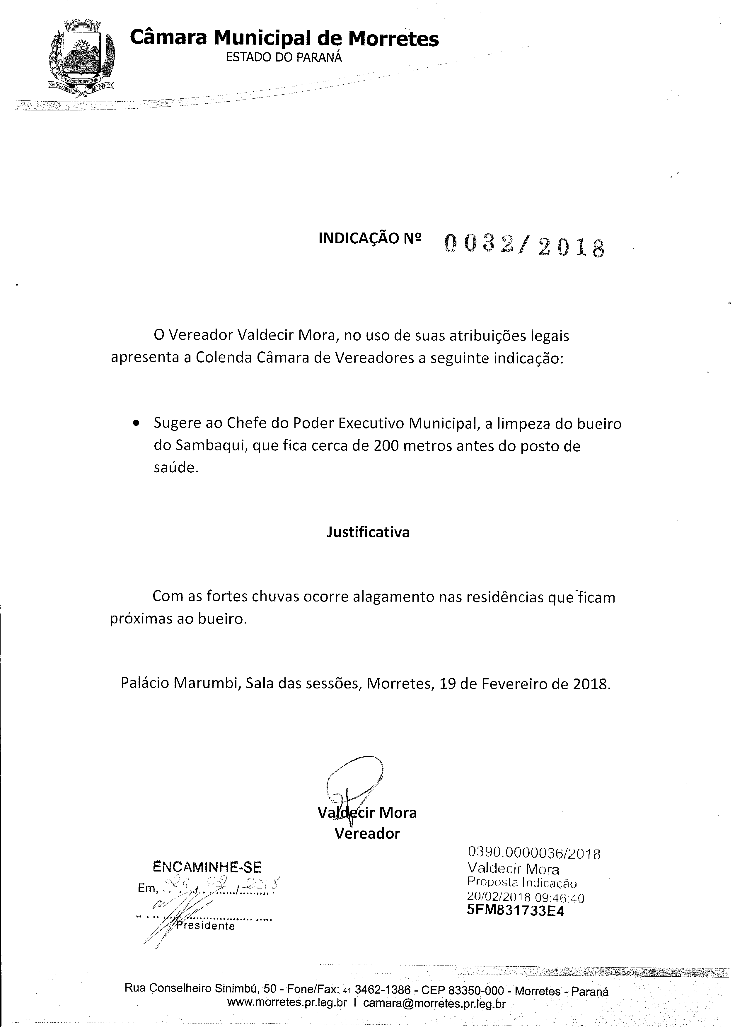 Ementa: SUGERE AO CHEFE DO PODER EXECUTIVO MUNICIPAL QUE SOLICITE A SECRETARIA COMPETENTE PARA ESTUDAR A POSSIBILIDADE DE REALIZAR, A LIMPEZA DO BUEIRA DO SAMBAQUI, QUE FICA CERCA DE 200 METROS ANTES DO POSTO DE SAÚDE.