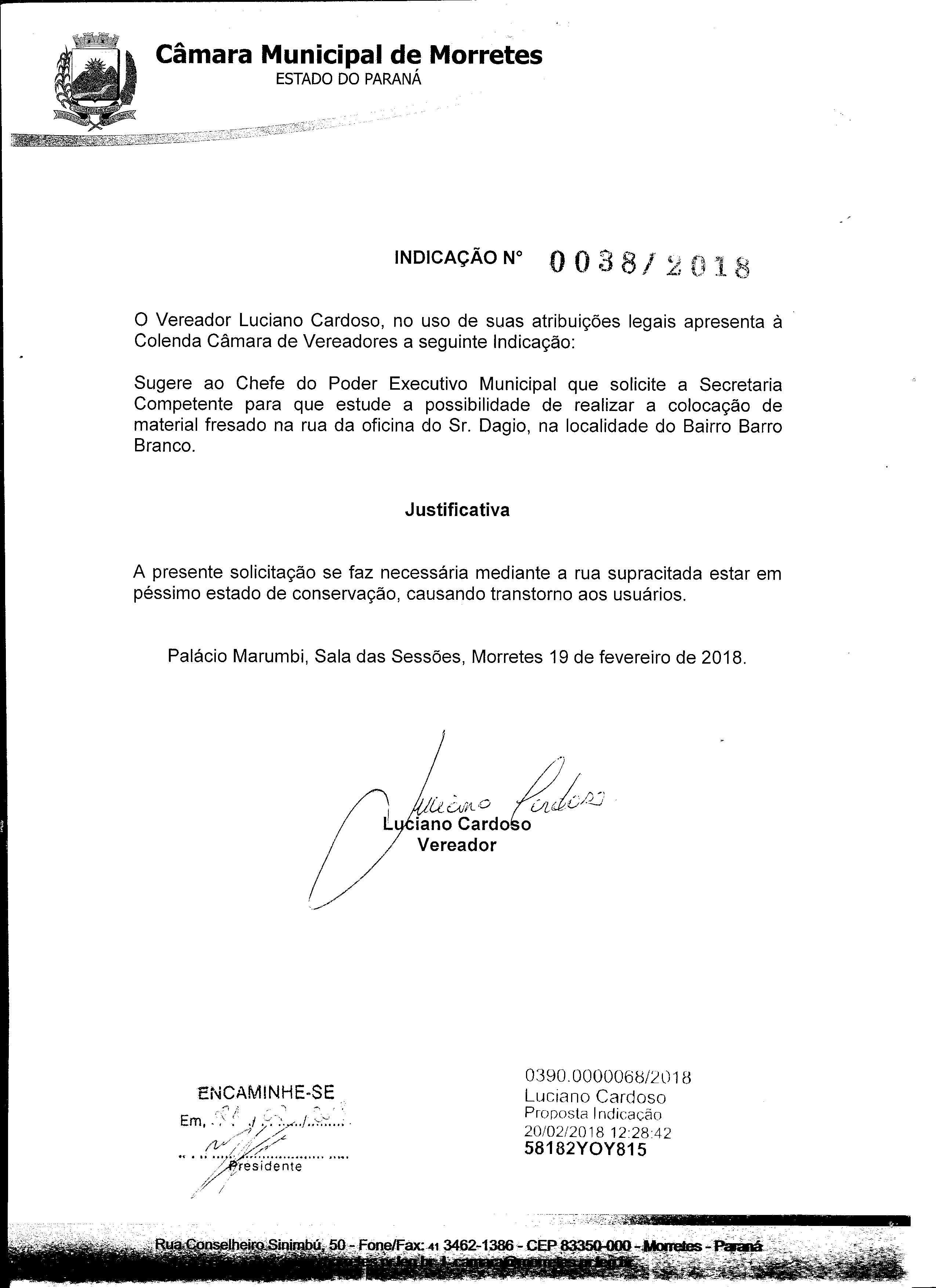 Ementa: SUGERE AO CHEFE DO PODER EXECUTIVO MUNICIPAL QUE SOLICITE A SECRETARIA COMPETENTE PARA ESTUDAR A POSSIBILIDADE DE REALIZAR A COLOCAÇÃO DE MATERIAL FRESADO NA RUA DA OFICINA DO SR. DAGIO, NA LOCALIDADE DO BAIRRO BARRO BRANCO.