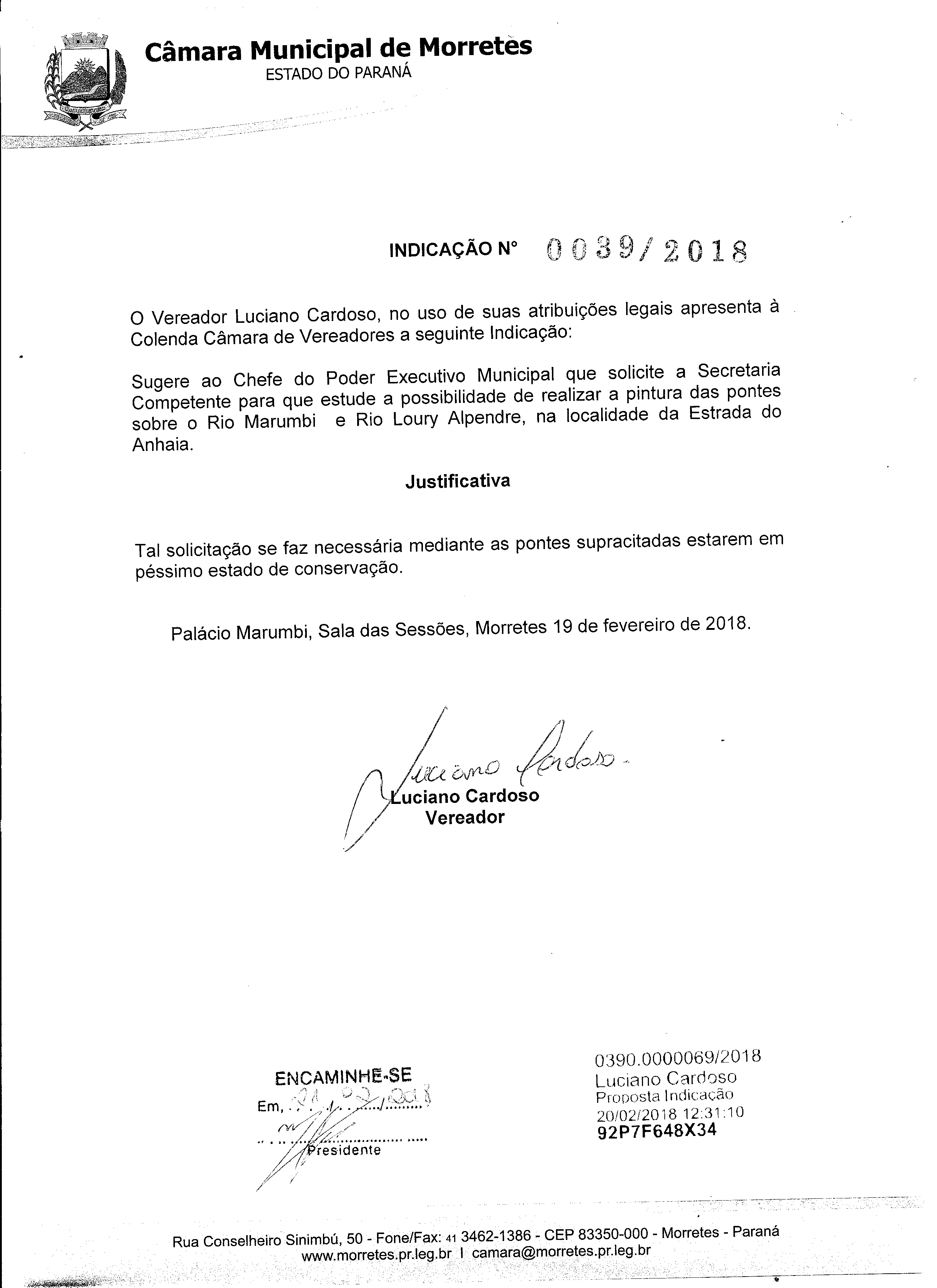 Ementa: SUGERE AO CHEFE DO PODER EXECUTIVO MUNICIPAL QUE SOLICITE A SECRETARIA COMPETENTE PARA ESTUDAR A POSSIBILIDADE DE REALIZAR A PINTURA DAS PONTES SOBRE O RIO MARUMBI E RIO LOURY ALPENDRE, NA LOCALIDADE DA ESTRADA DO ANHAIA.