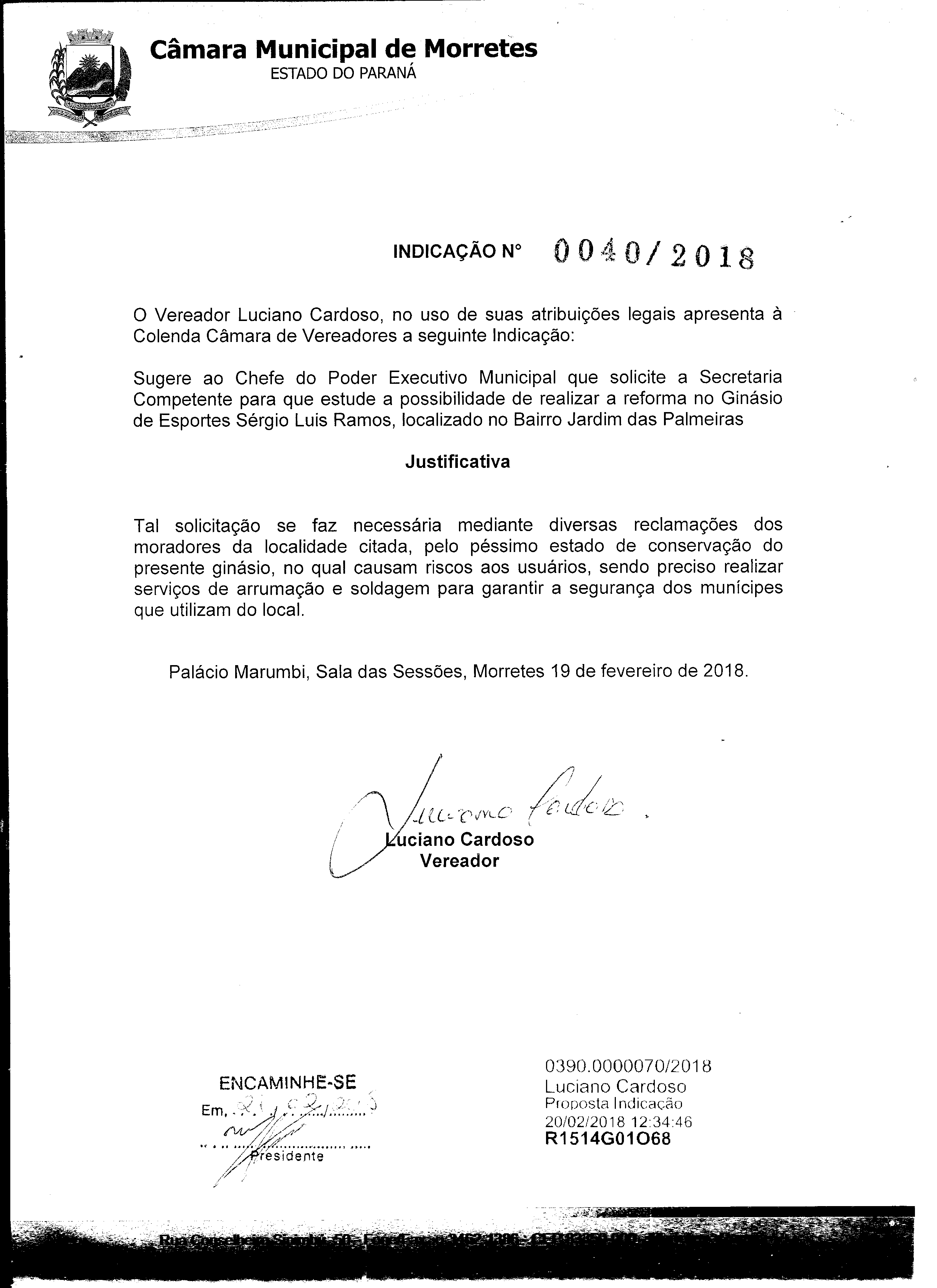 Ementa: SUGERE AO CHEFE DO PODER EXECUTIVO MUNICIPAL QUE SOLICITE A SECRETARIA COMPETENTE PARA ESTUDAR A POSSIBILIDADE DE REALIZAR A REFORMA NO GINÁSIO DE ESPORTES SÉRGIO LUIS RAMOS, LOCALIZADO NO BAIRRO JARDIM DAS PALMEIRAS.
