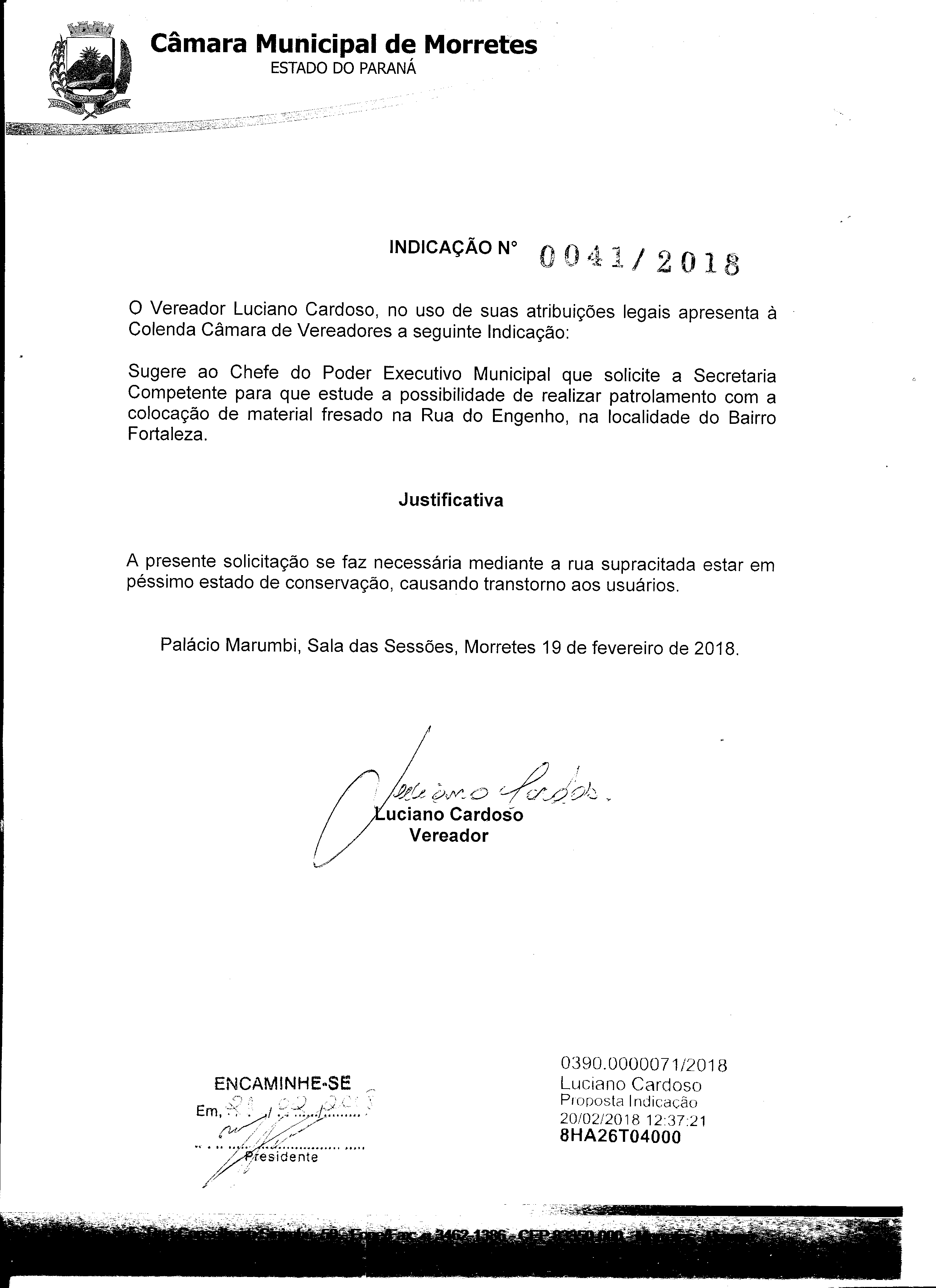 Ementa: SUGERE AO CHEFE DO PODER EXECUTIVO MUNICIPAL QUE SOLICITE A SECRETARIA COMPETENTE PARA ESTUDAR A POSSIBILIDADE DE REALIZAR PATROLAMENTO COM A COLOCAÇÃO DE MATERIAL FRESADO NA RUA DO ENGENHO, NA LOCALIDADE DO BAIRRO FORTALEZA.