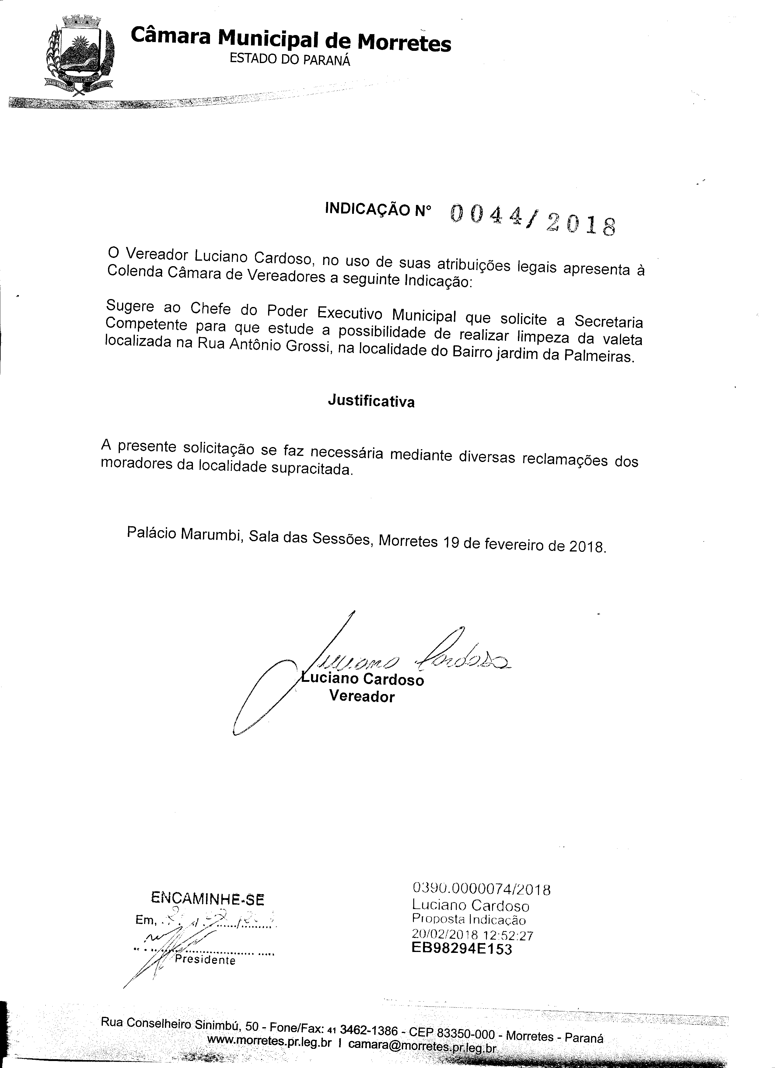Ementa: SUGERE AO CHEFE DO PODER EXECUTIVO MUNICIPAL QUE SOLICITE A SECRETARIA COMPETENTE PARA ESTUDAR A POSSIBILIDADE DE REALIZAR LIMPEZA DA VALETA LOCALIDADE NA RUA ANTÔNIO GROSSI, NA LOCALIDADE DO BAIRRO JARDIM DAS PALMEIRAS.