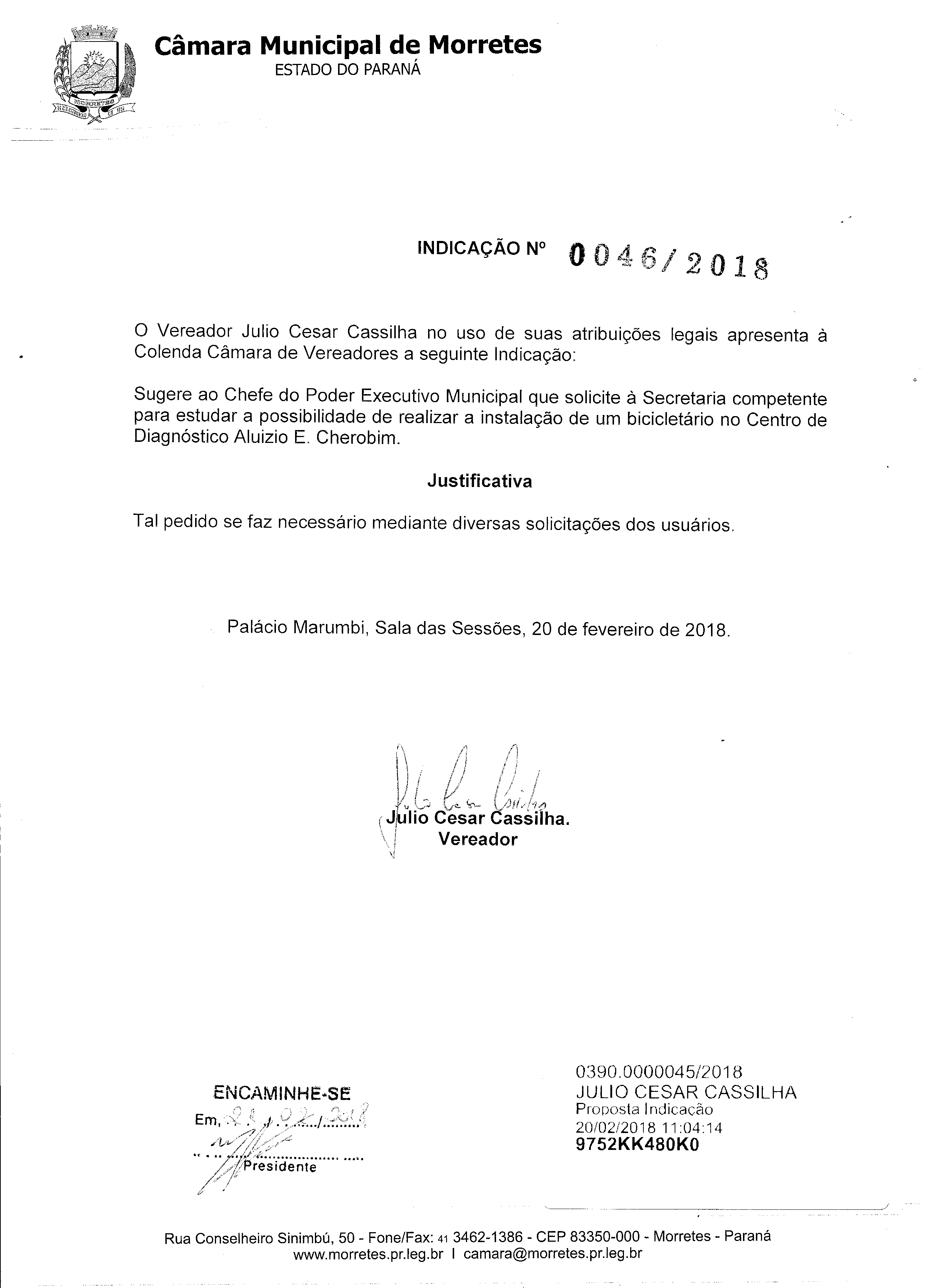Ementa: SUGERE AO CHEFE DO PODER EXECUTIVO MUNICIPAL QUE SOLICITE A SECRETARIA COMPETENTE PARA ESTUDAR A POSSIBILIDADE DE REALIZAR A INSTALAÇÃO DE UM BICICLETÁRIO NO CENTRO DE DIAGNÓSTICO ALUIZIO E. CHEROBIM.