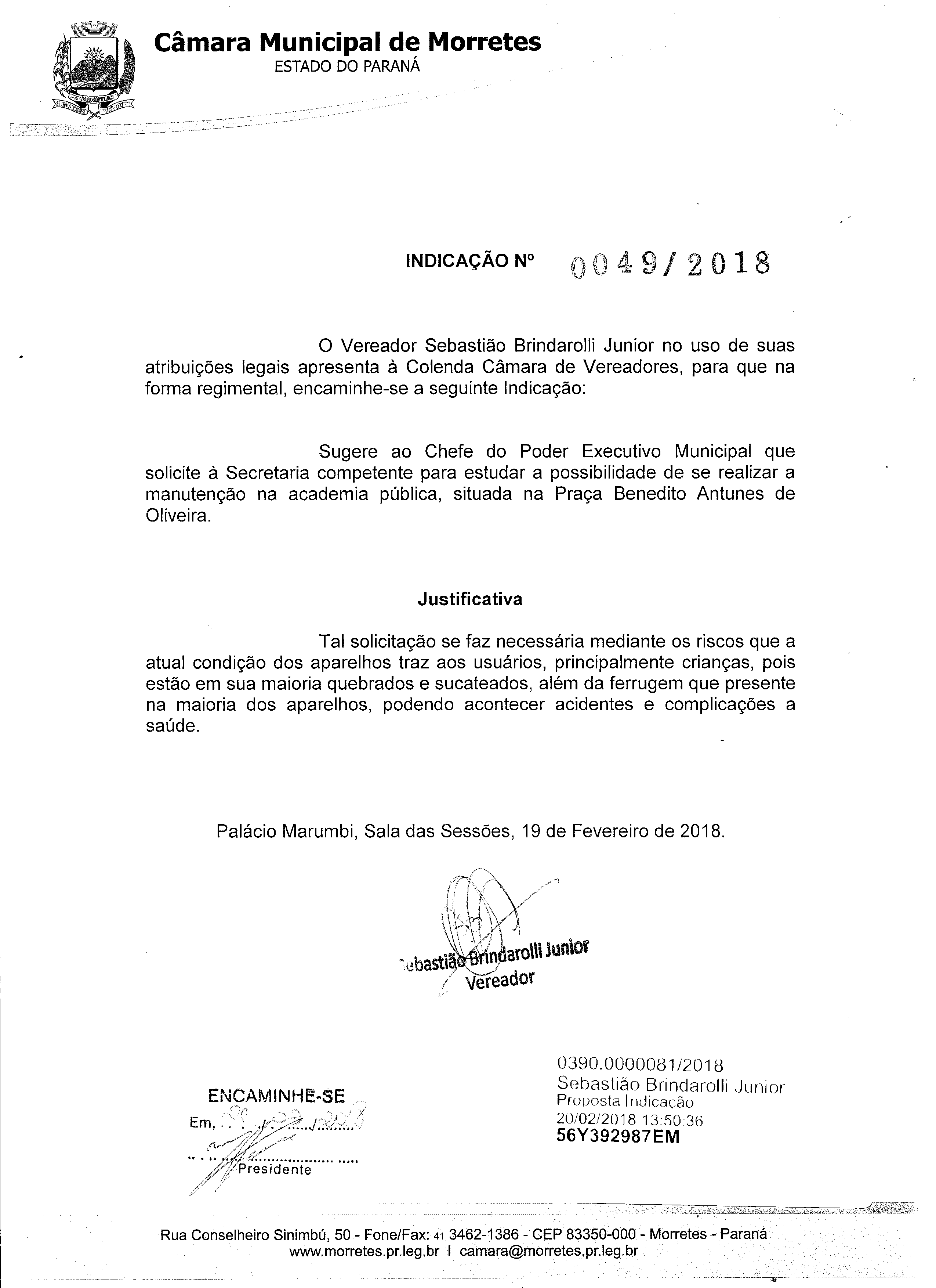 Ementa: SUGERE AO CHEFE DO PODER EXECUTIVO MUNICIPAL QUE SOLICITE A SECRETARIA COMPETENTE PARA ESTUDAR A POSSIBILIDADE DE REALIZAR A MANUTENÇÃO NA ACADEMIA PÚBLICA, SITUADA NA PRAÇA BENEDITO ANTUNES DE OLIVEIRA.