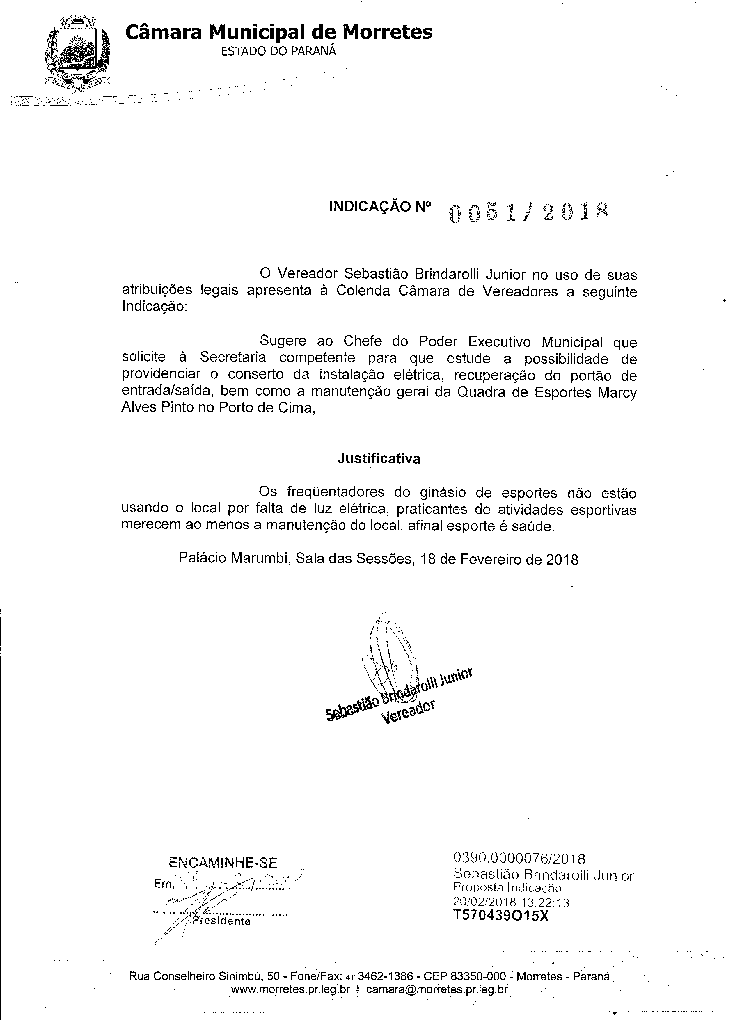 Ementa: SUGERE AO CHEFE DO PODER EXECUTIVO MUNICIPAL QUE SOLICITE A SECRETARIA COMPETENTE PARA ESTUDAR A POSSIBILIDADE DE PROVIDENCIAR O CONSERTO DA INSTALAÇÃO ELÉTRICA RECUPERAÇÃO DO PORTÃO DE ENTRADA/SAÍDA, BEM COMO A MANUTENÇÃO GERAL DA QUADRA DE ESPORTES MARCY ALVES PINTO NO PORTO DE CIMA.