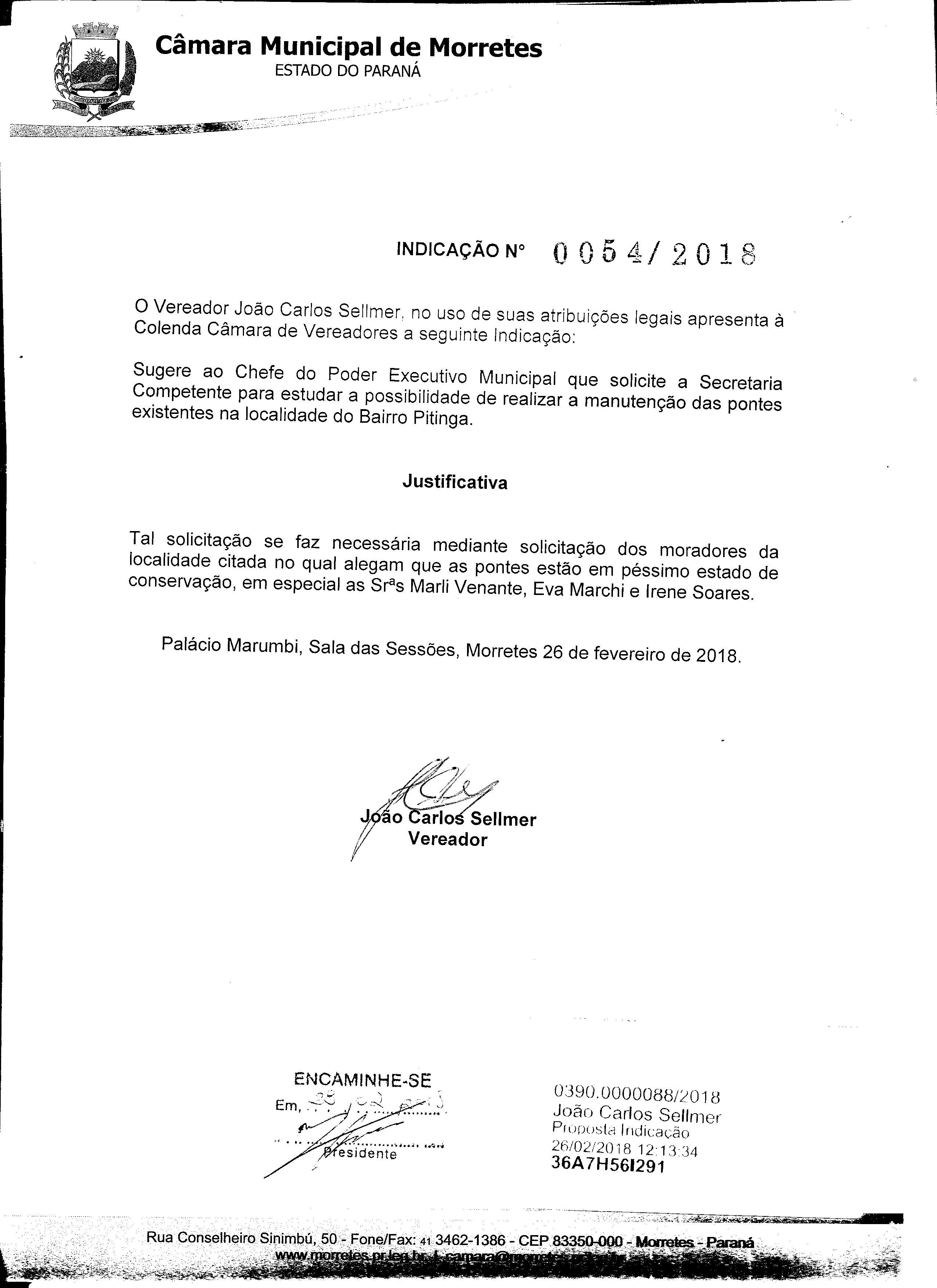 Ementa: SUGERE AO CHEFE DO PODER EXECUTIVO MUNICIPAL QUE SOLICITE A SECRETARIA COMPETENTE PARA ESTUDAR A POSSIBILIDADE DE REALIZAR A MANUTENÇÃO DAS PONTES EXISTENTES NA LOCALIDADE DO BAIRRO PITINGA.