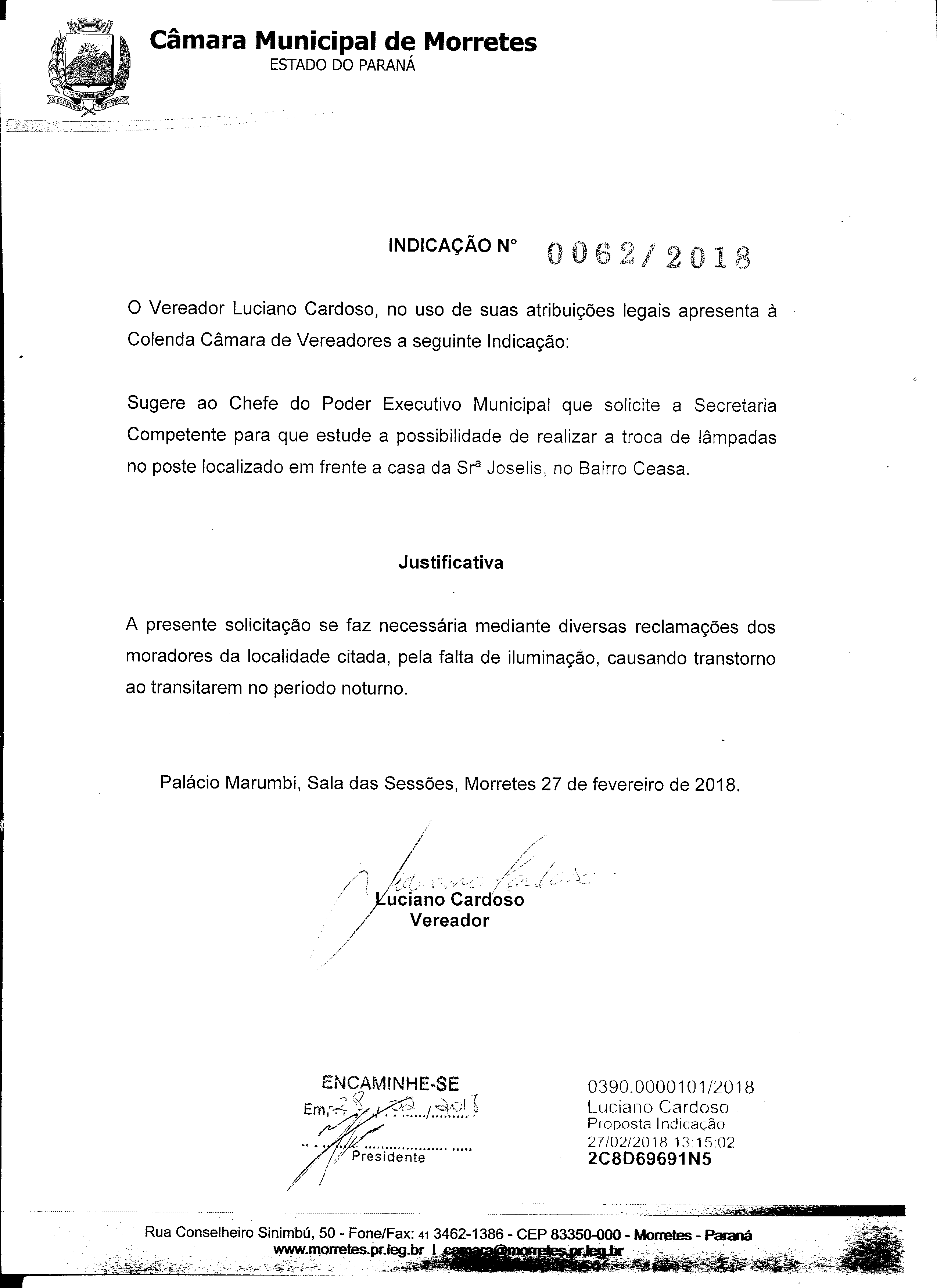 Ementa: SUGERE AO CHEFE DO PODER EXECUTIVO MUNICIPAL QUE SOLICITE A SECRETARIA COMPETENTE PARA ESTUDAR A POSSIBILIDADE DE REALIZAR A TROCA DE LÂMPADAS NO POSTE LOCALIZADO EM FRENTE A CASA DA SRª JOSELIS, NO BAIRRO CEASA