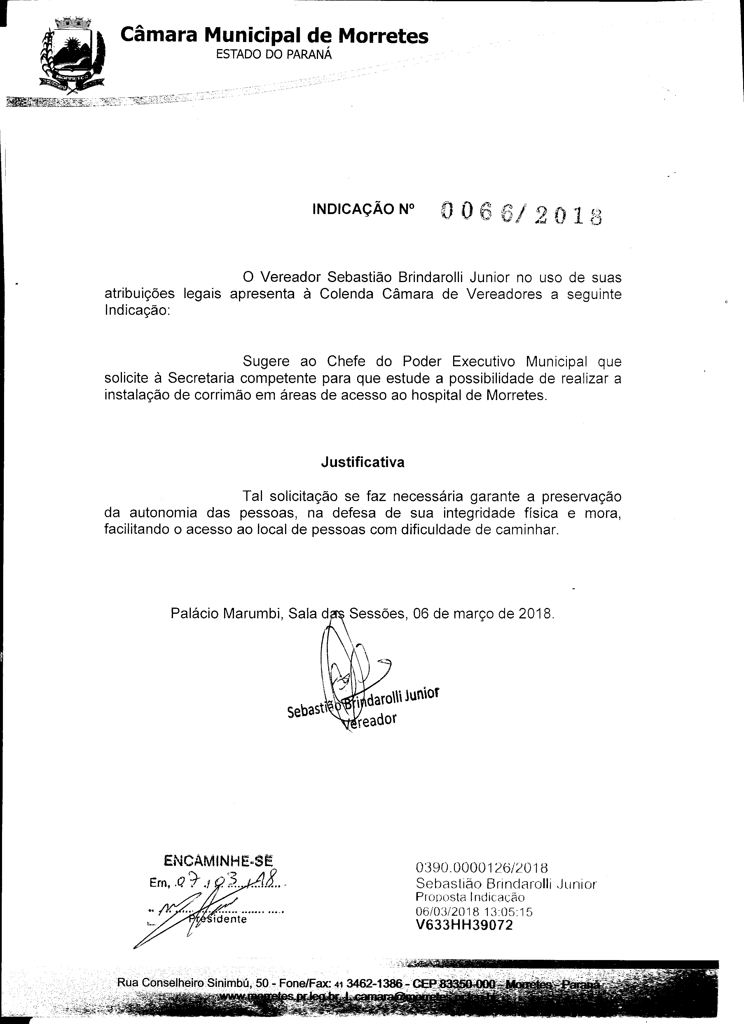 Ementa: SUGERE AO CHEFE DO PODER EXECUTIVO MUNICIPAL QUE SOLICITE A SECRETARIA COMPETENTE PARA ESTUDAR A POSSIBILIDADE DE REALIZAR A INSTALAÇÃO DE CORRIMÃO EM ÁREAS DE ACESSO AO HOSPITAL DE MORRETES.