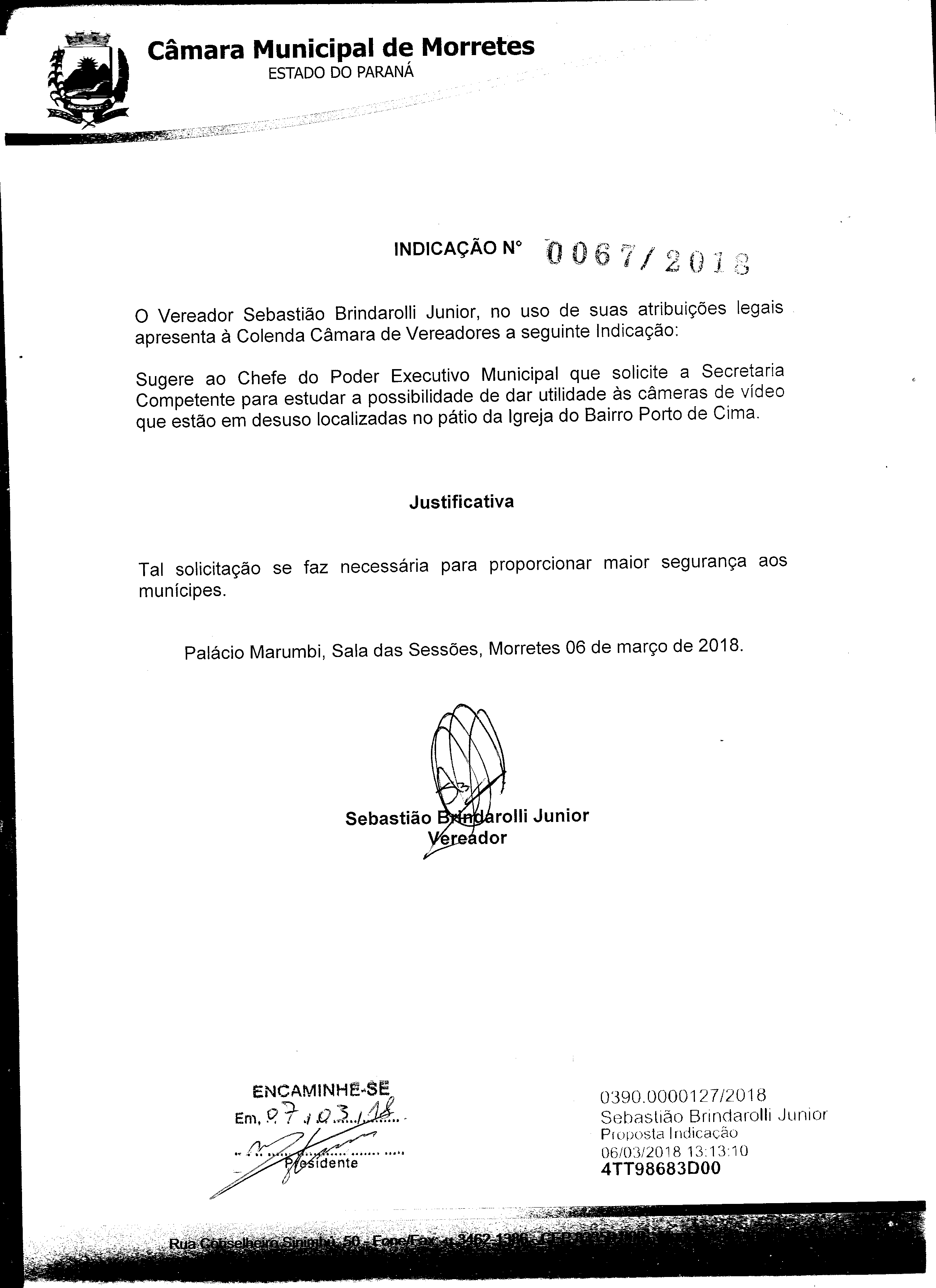Ementa: SUGERE AO CHEFE DO PODER EXECUTIVO MUNICIPAL QUE SOLICITE A SECRETARIA COMPETENTE PARA ESTUDAR A POSSIBILIDADE DE DAR UTILIDADE ÀS CÂMERAS DE VÍDEO QUE ESTÃO EM DESUSO LOCALIZADAS NO PÁTIO DA IGREJA DO BAIRRO PORTO DE CIMA.