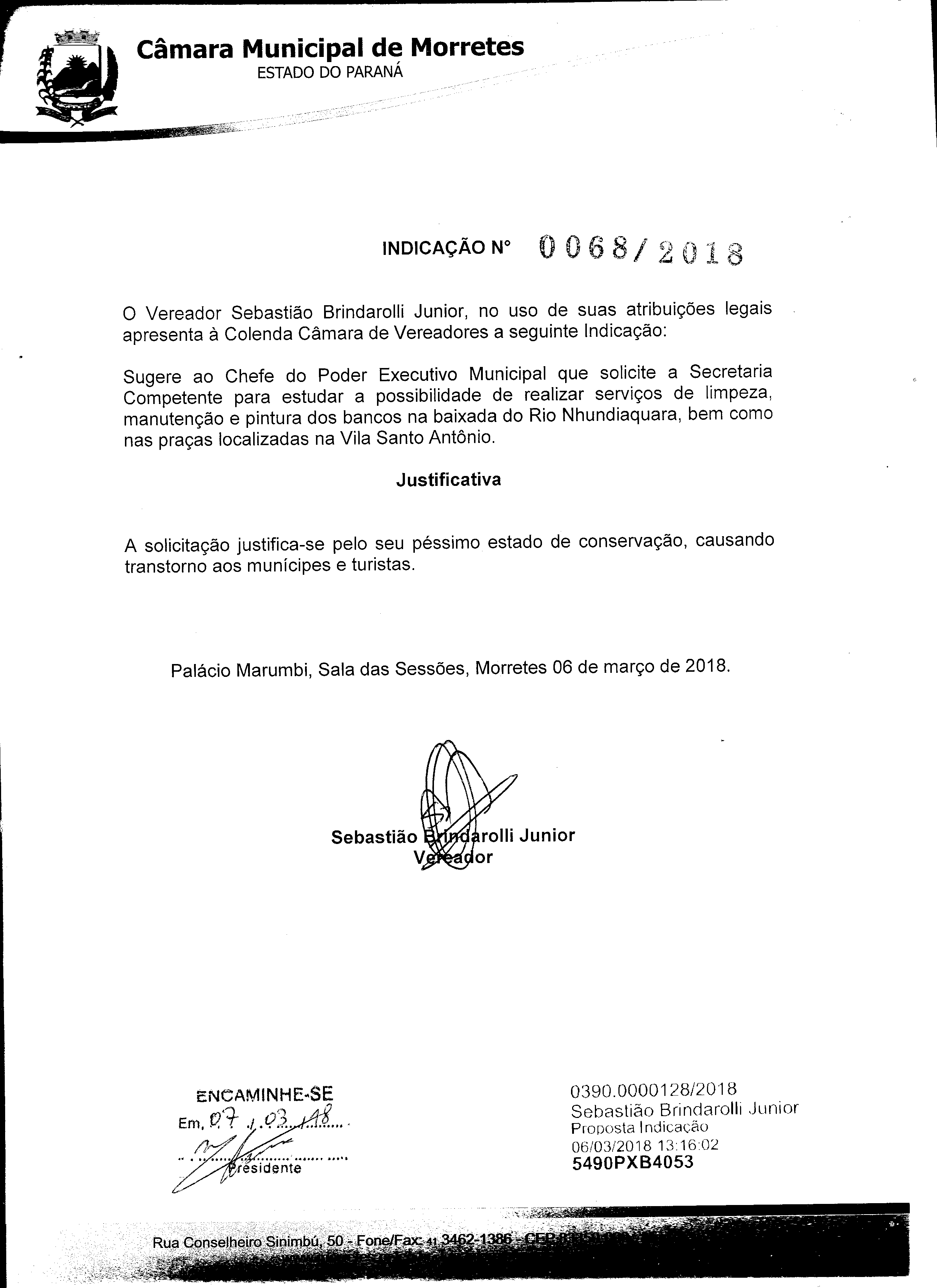 Ementa: SUGERE AO CHEFE DO PODER EXECUTIVO MUNICIPAL QUE SOLICITE A SECRETARIA COMPETENTE PARA ESTUDAR A POSSIBILIDADE DE REALIZAR SERVIÇOS DE LIMPEZA, MANUTENÇÃO E PINTURAS DOS BANCOS NA BAIXADA DO RIO NHUNDIAQUARA, BEM COMO NAS PRAÇAS LOCALIZADAS NA VILA SANTO ANTÔNIO.