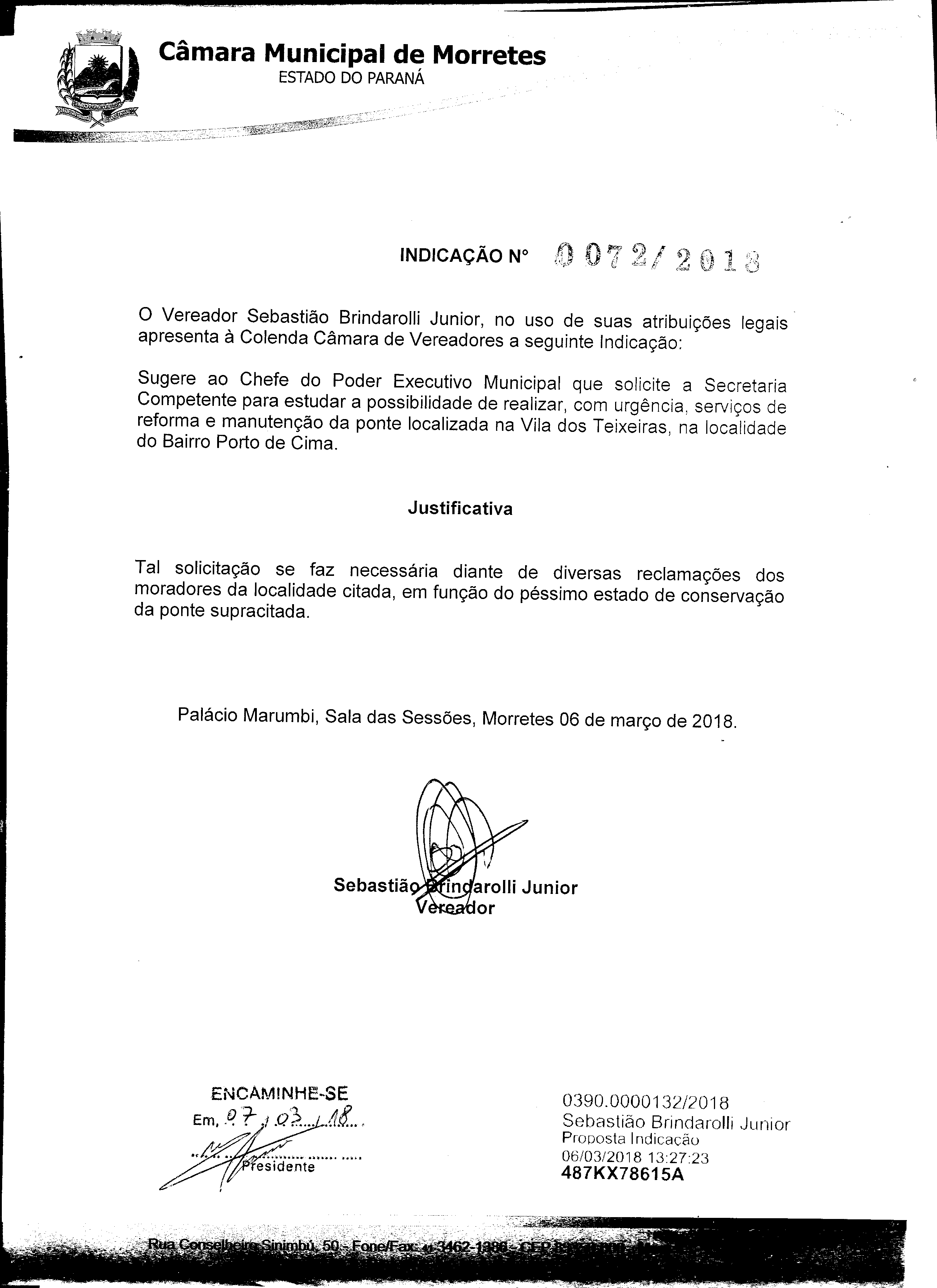 Ementa: SUGERE AO CHEFE DO PODER EXECUTIVO MUNICIPAL QUE SOLICITE A SECRETARIA COMPETENTE PARA ESTUDAR A POSSIBILIDADE DE REALIZAR, COM URGÊNCIA, SERVIÇOS DE REFORMA E MANUTENÇÃO DA PONTE LOCALIZADA NA VILA DOS TEIXEIRAS, NA LOCALIDADE DO BAIRRO PORTO DE CIMA.