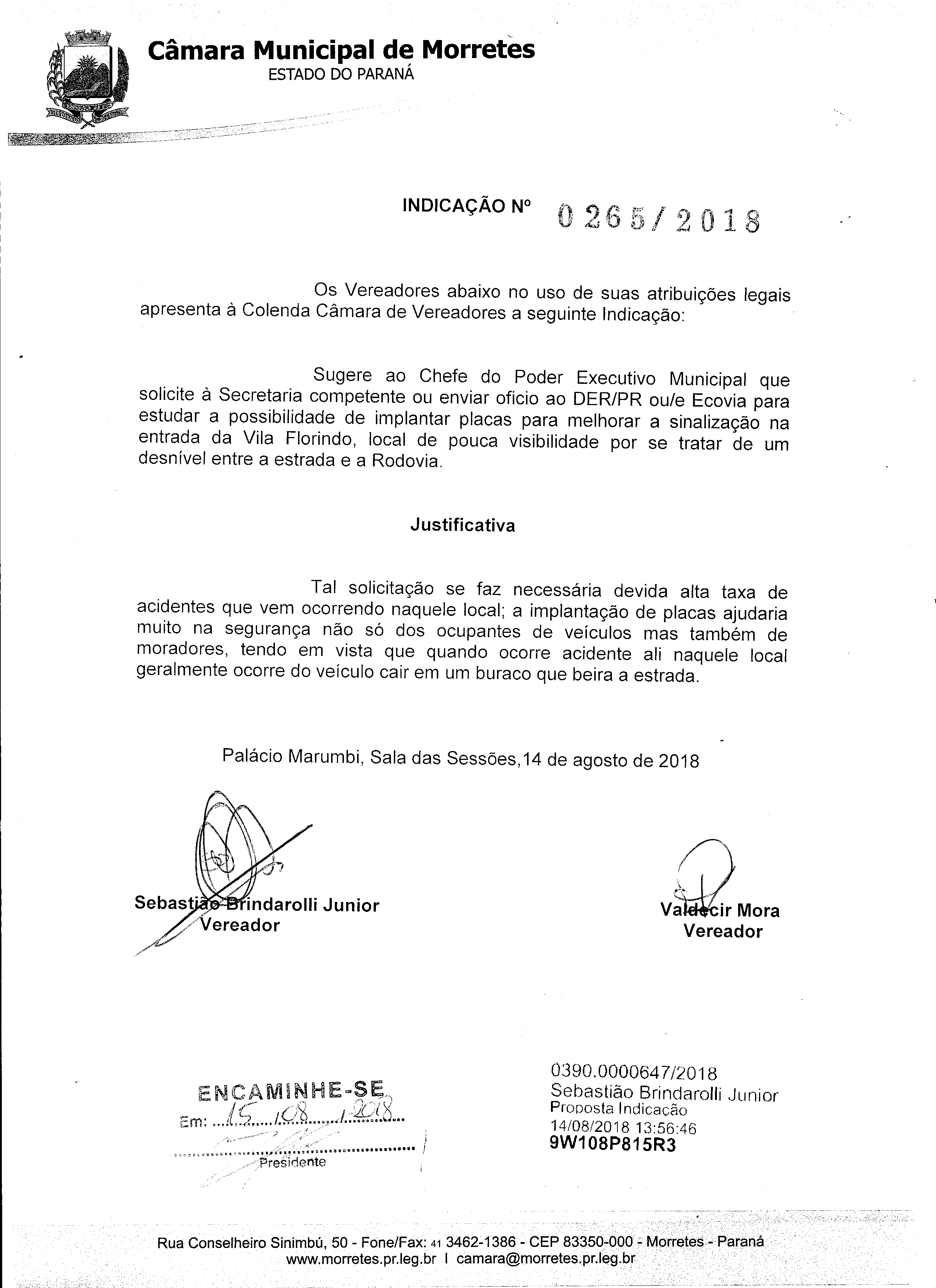 Ementa: SUGERE AO CHEFE DO PODER EXECUTIVO MUNICIPAL QUE SOLICITE À SECRETARIA COMPETENTE PARA ENVIAR OFICIO AO DER/PR OU/E ECOVIA PARA ESTUDAR A POSSIBILIDADE DE IMPLANTAR PLACAS PARA MELHORAR A SINALIZAÇÃO NA ENTRADA DA VILA FLORINDO, LOCAL DE POUCA VISIBILIDADE POR SE TRATAR DE UM DESNÍVEL ENTRE A ESTRADA E A RODOVIA.
