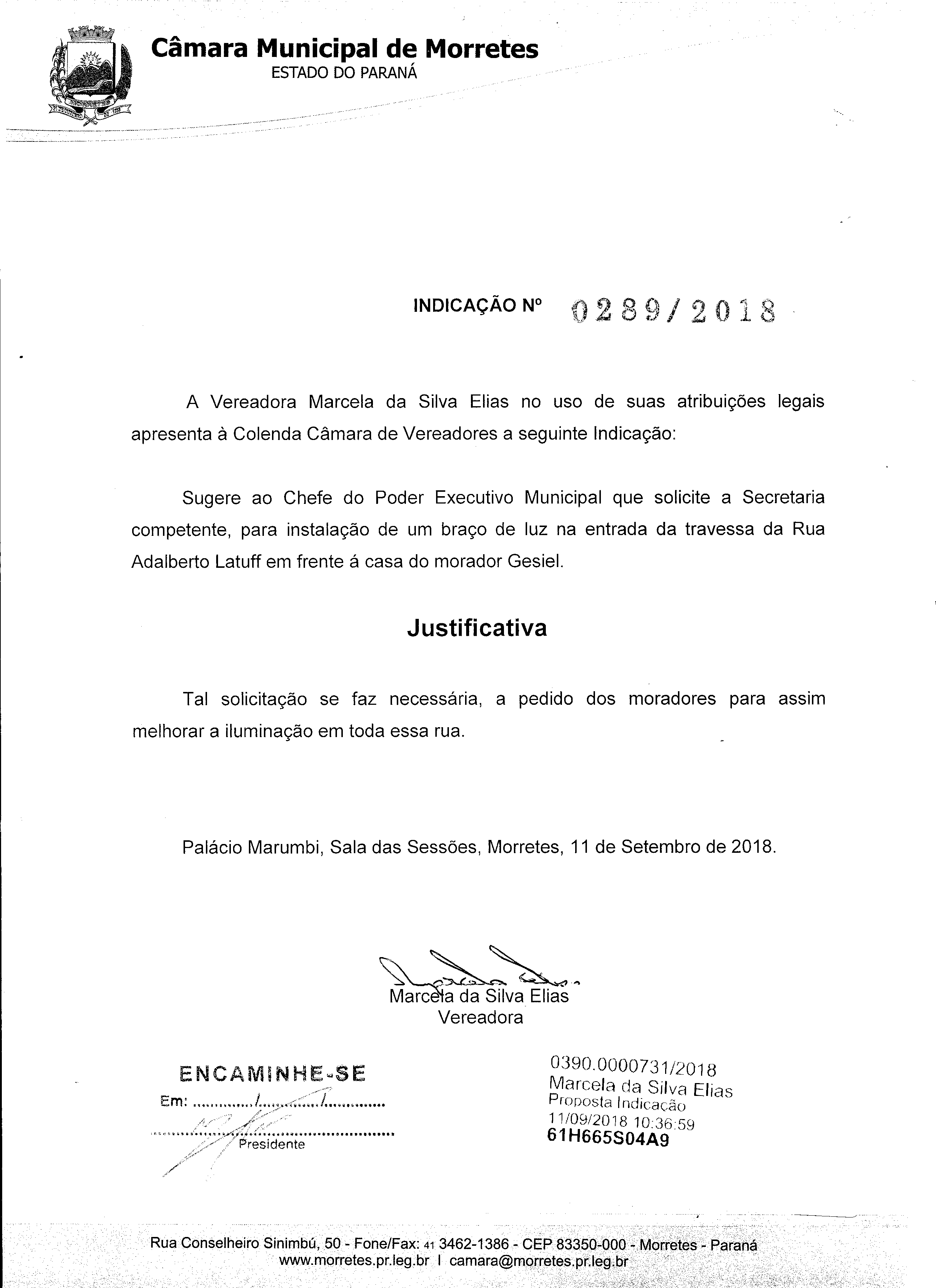 Ementa: SUGERE AO CHEFE DO PODER EXECUTIVO MUNICIPAL QUE SOLICITE A SECRETARIA COMPETENTE, PARA ESTUDAR A POSSIBILIDADE DE INSTALAR UM BRAÇO DE LUZ NA RUA ADALBERTO LATUFF, EM FRENTE A CHÁCARA DA MORADORA MARILIZ.