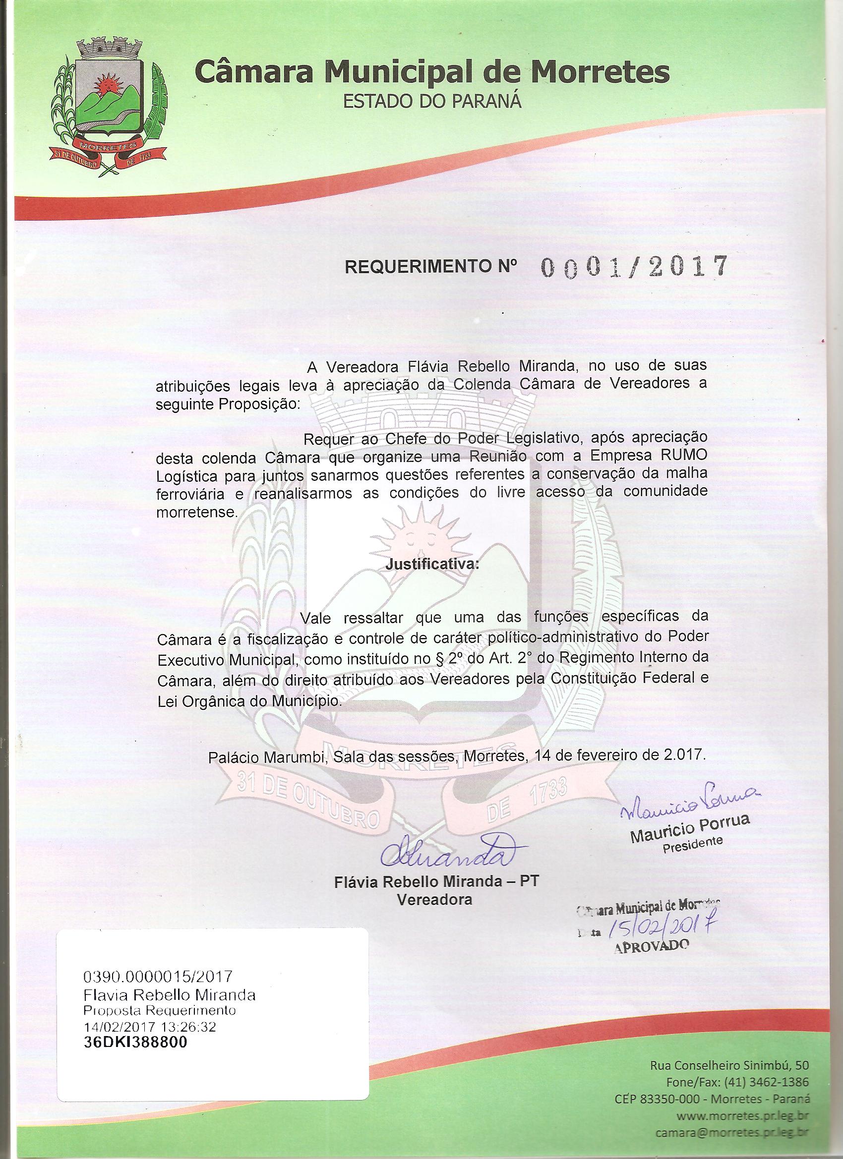 ![]() REQUER AO CHEFE DO PODER LEGISLATIVO ,APÓS APRECIAÇÃO DESTA COLENDA CÂMARA QUE ORGANIZE UMA REUNIÃO COM A EMPRESA RUMO LOGÍSTICA PARA JUNTOS SANARMOS QUESTÕES REFERENTES A CONSERVAÇÃO DA MALHA FERROVIÁRIA E REANALISARMOS OS CONDIÇÕES DO LIVRE ACESSO DA COMUNIDADE MORRETENSE.