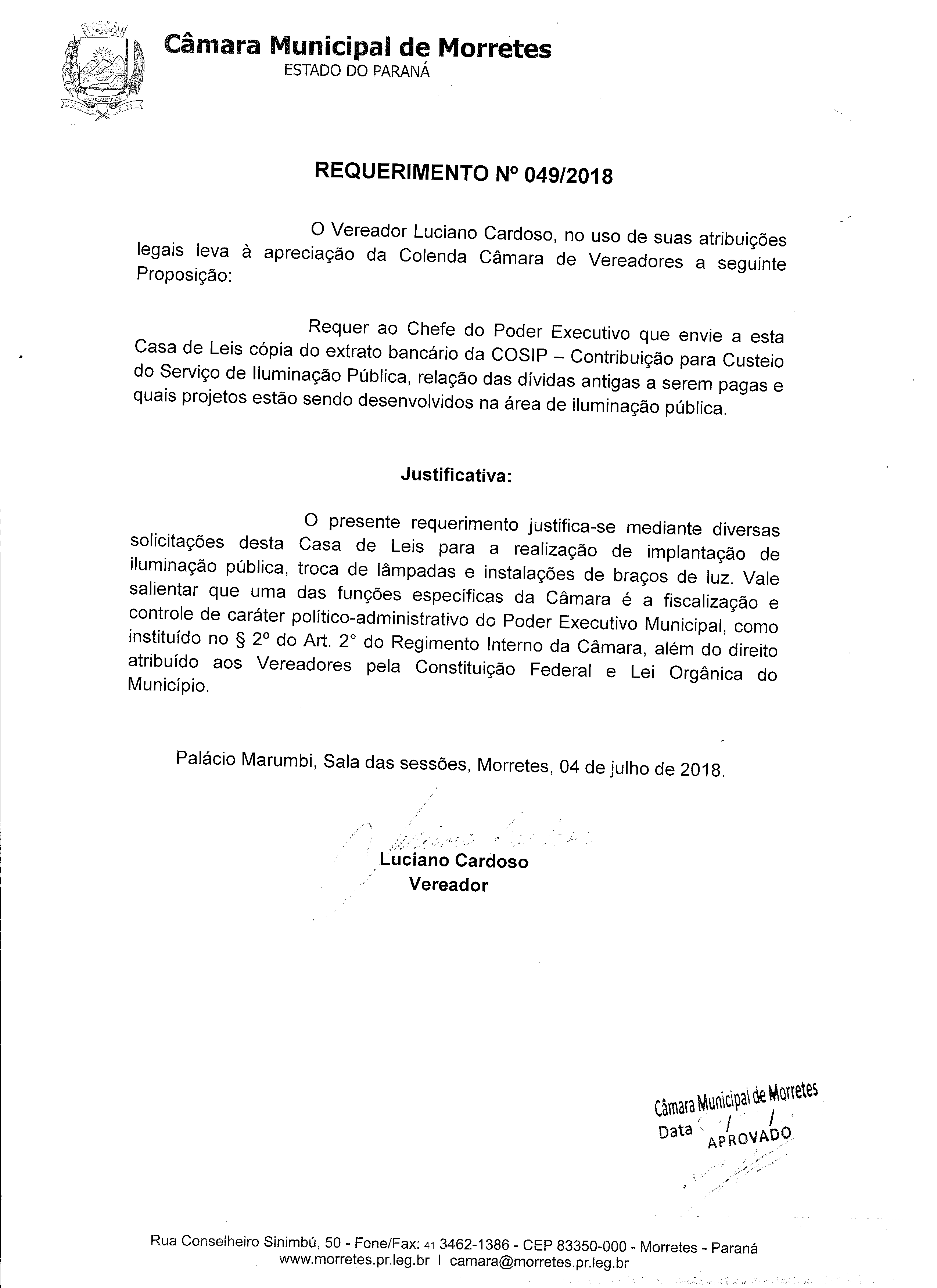 ![]() REQUER AO CHEFE DO PODER EXECUTIVO MUNICIPAL, APÓS APRECIAÇÃO DESTA COLENDA CÂMARA MUNICIPAL, QUE SE ENCAMINHE A ESTA CASA DE LEIS O EXTRATO BANCÁRIO DA COSIP- CONTRIBUIÇÃO PARA O CUSTEIO DO SERVIÇO DE ILUMINAÇÃO PÚBLICA, A PARTIR DO MÊS DE FEVEREIRO DE 2018 ATÉ A PRESENTE DATA DO CORRENTE ANO.