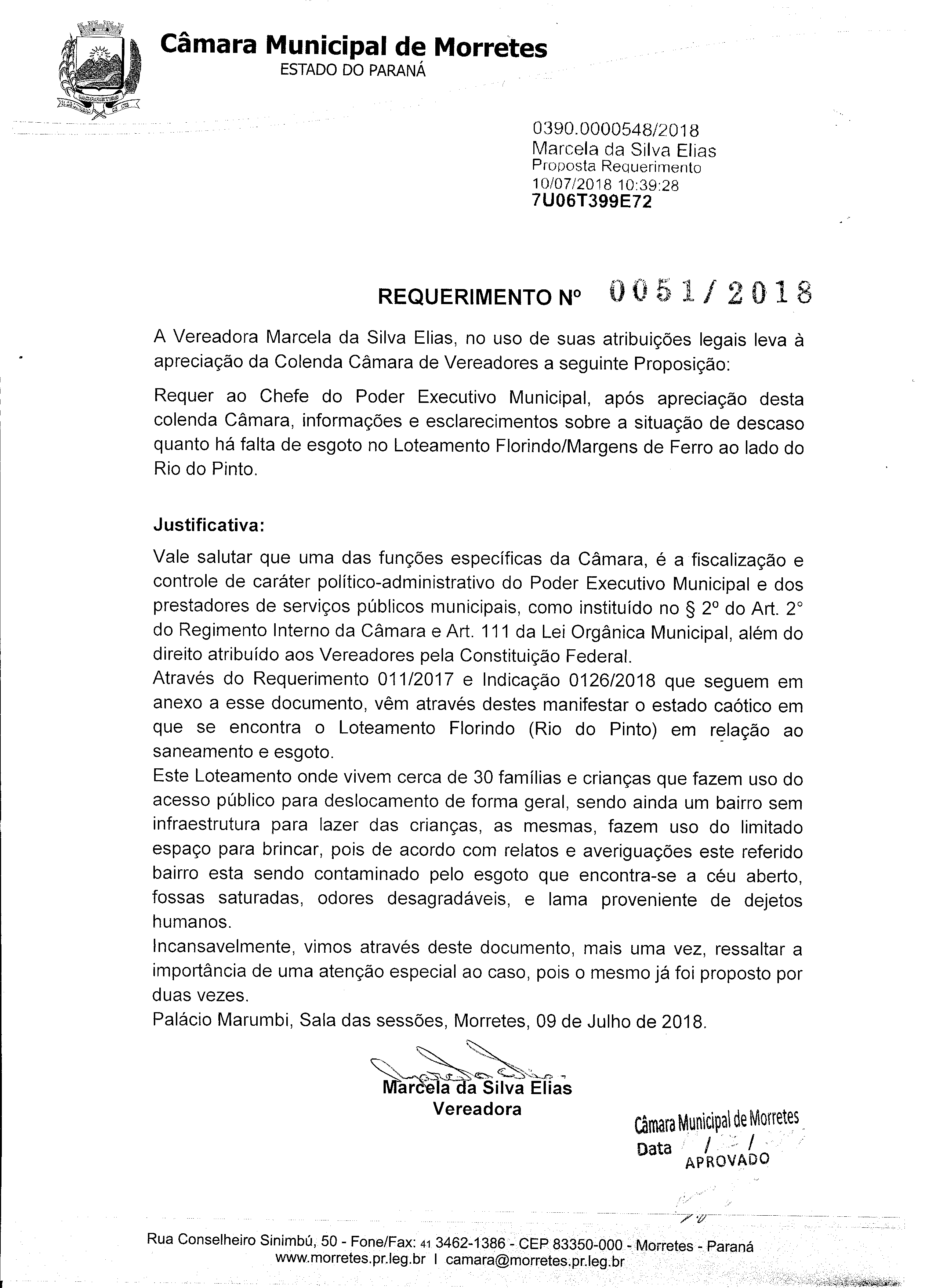 ![]() REQUEE AO CHEFE DO PODER EXECUTIVO MUNICIPAL, APÓS APRECIAÇÃO DESTA COLENDA CÂMARA, INFORMAÇÕES E ESCLARECIMENTOS SOBRE A SITUAÇÃO DE DESCASO QUANTO HÁ FALTA DE ESGOTO NO LOTEAMENTO FLORINDO/ MARGENS DE FERRO AO LADO DO RIO DO PINTO.