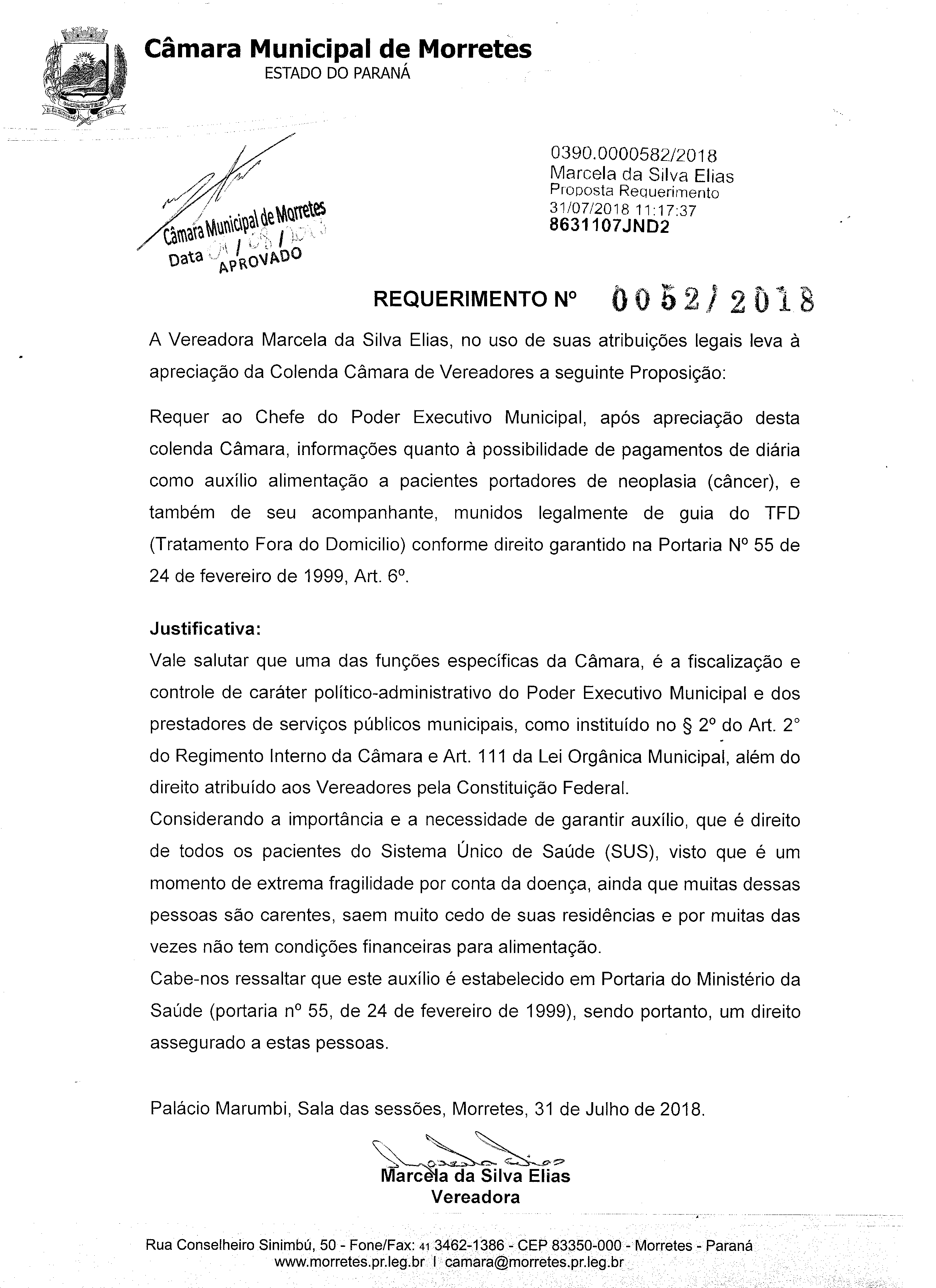 ![]() REQUER AO CHEFE DO PODER EXECUTIVO MUNICIPAL, APÓS APRECIAÇÃO DESTA COLENDA CÂMARA, INFORMAÇÕES QUANTO Á POSSIBILIDADE DE PAGAMENTOS DE DIÁRIA COMO AUXILIO ALIMENTAÇÃO A PACIENTE PORTADORES DE NEOPLASIA ( CÂNCER) E TAMBÉM DE SEU ACOMPANHANTE,MUNIDOS LEGALMENTE DE GUIA DO TFD( TRATAMENTO FORA DE DOMICILIO) CONFORME DIREITO GARANTIDO NA PORTARIA Nº 55 DE 24 DE FEVEREIRO DE 1999, ART. 6º.