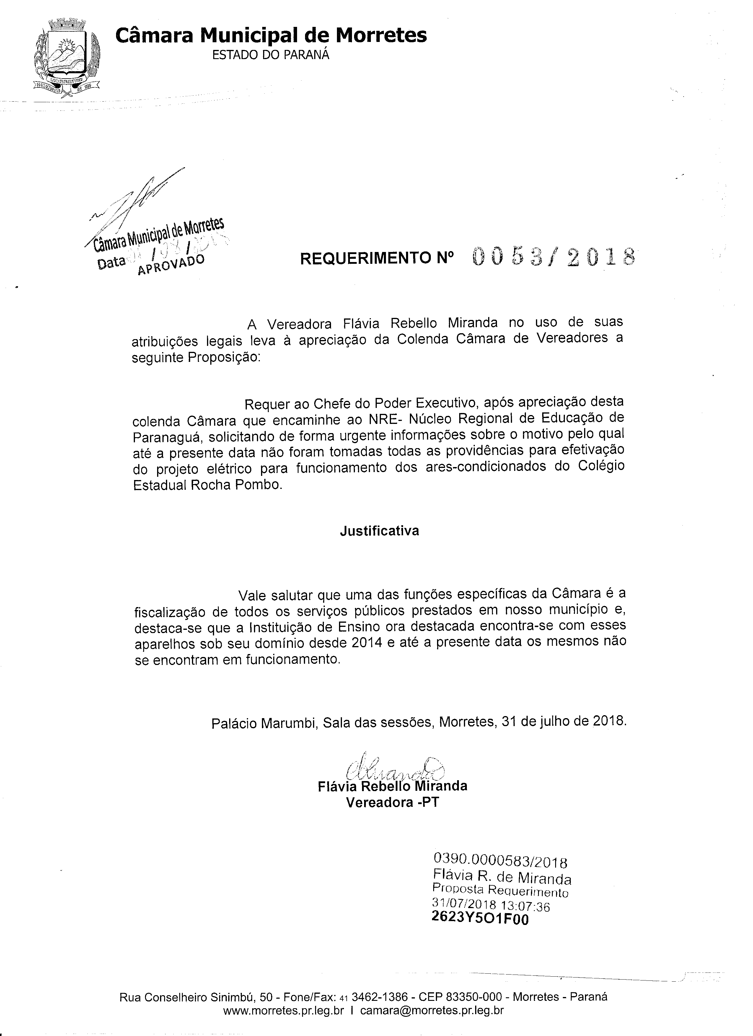 ![]() REQUER AO CHEFE DO PODER EXECUTIVO MUNICIPAL, APÓS APRECIAÇÃO DESTA COLENDA CÂMARA, QUE ENCAMINHE AO NRE- NÚCLEO REGIONAL DE EDUCAÇÃO DE PARANAGUÁ, SOLICITANDO DE FORMA URGENTE INFORMAÇÕES SOBRE O MOTIVO PELO QUAL ATÉ A PRESENTE DATA NÃO FORAM TOMADAS TODAS AS PROVIDÊNCIAS PARA EFETIVAÇÃO DO PROJETO ELÉTRICO PARA FUNCIONAMENTO DOS ARES- CONDICIONADOS DO COLÉGIO ESTADUAL ROCHA POMBO.