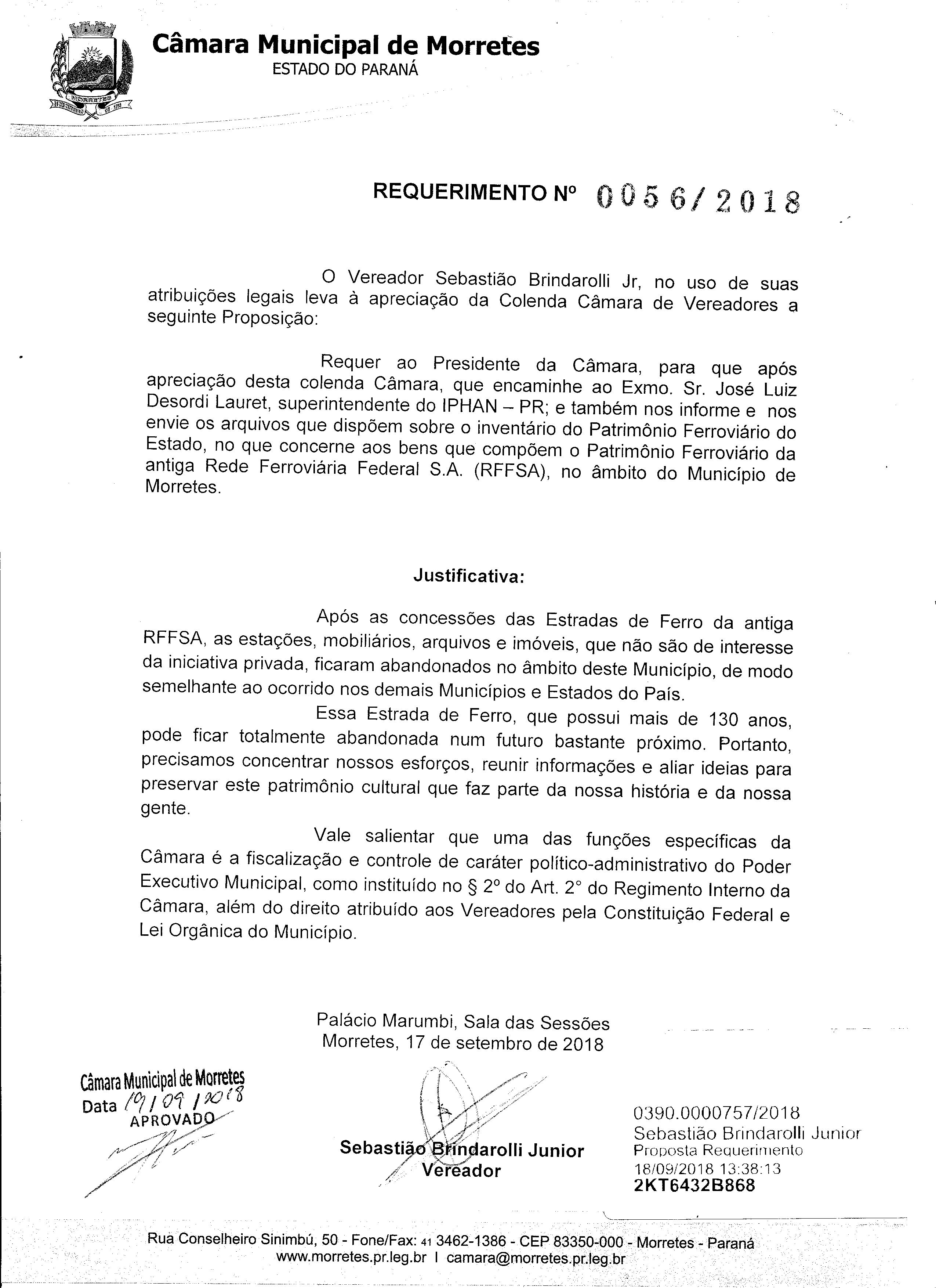 ![]() REQUER AO PRESIDENTE DA CÂMARA, PARA APÓS APRECIAÇÃO DESTA COLENDA CÂMARA, QUE ENCAMINHE AO EXMO. SR. JOSÉ LUIZ DESORDI LAURET, SUPERINTENDENTE DO IPHAN - PR; E TAMBÉM NOS INFORME E NOS ENVIE OS ARQUIVOS QUE DISPÕEM SOBRE INVENTÁRIO DO PATRIMÔNIO FERROVIÁRIO DO ESTADO , NO QUE CONCERNE AOS BENS QUE COMPÕEM O PATRIMÔNIO FERROVIÁRIO DA ANTIGA REDE FERROVIÁRIA FEDERAL S.A. ( RFFSA), NO ÂMBITO DO MUNICÍPIO DE MORRETES.